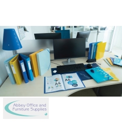 Bee Blue is an eco-friendly selection of Exacompta filing and desktop accessories. The range is created using Blue Angel certified recycled Polypropylene which gives a second life to old materials and incorporates a choice of 4 vivid colours of saffron, navy blue, light blue and turquoise. With excellent document retention thanks to the 3 interior flaps and the 2 blue elastic bands, it is convenient for transporting and storing documents. The Bee Blue filing box is designed in a 250 x 330mm format to accommodate A4 documents along with elastic folders, files and sub-files. Featuring a spine label to identify contents, this 40mm box file with elasticated closures is supplied in a pack of 8.