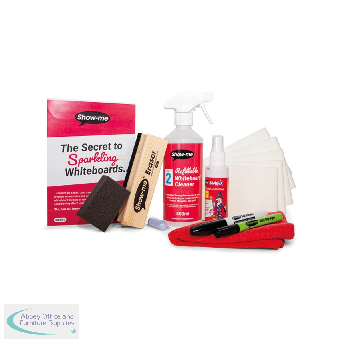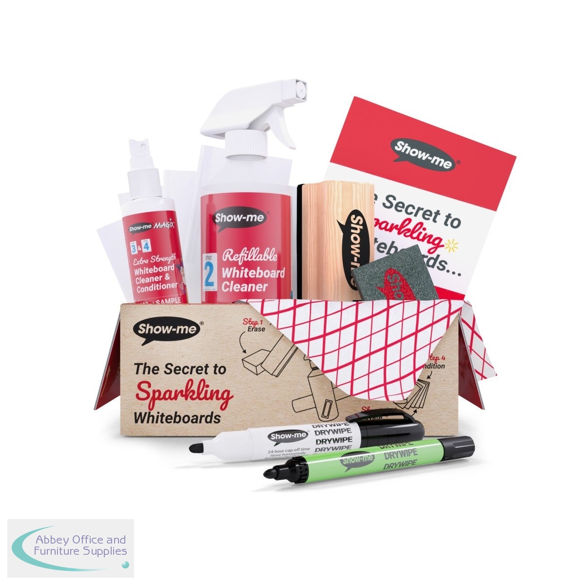 The secret to sparkling whiteboards couldn't be easier. Just treat them with care, use proper drywipe accessories and use a specially formulated whiteboard cleaner at regular intervals. This starter set will give you everything you need to do just that. 1 x Mini foam eraser, 1 x Large wooden handled eraser, 1 x 500ml Refillable whiteboard cleaner, 1 x Dissolvable whiteboard cleaner sachet, 1 x Luxury soft renovator cloth - colour may vary, 1 x 100ml Magix whiteboard renovator & conditioner - Sample, 5 x Premium multi-use cleaning tissues, 1 x Show-me medium tip drywipe marker, black, 1 x Show-me Teacher, drywipe marker, black.