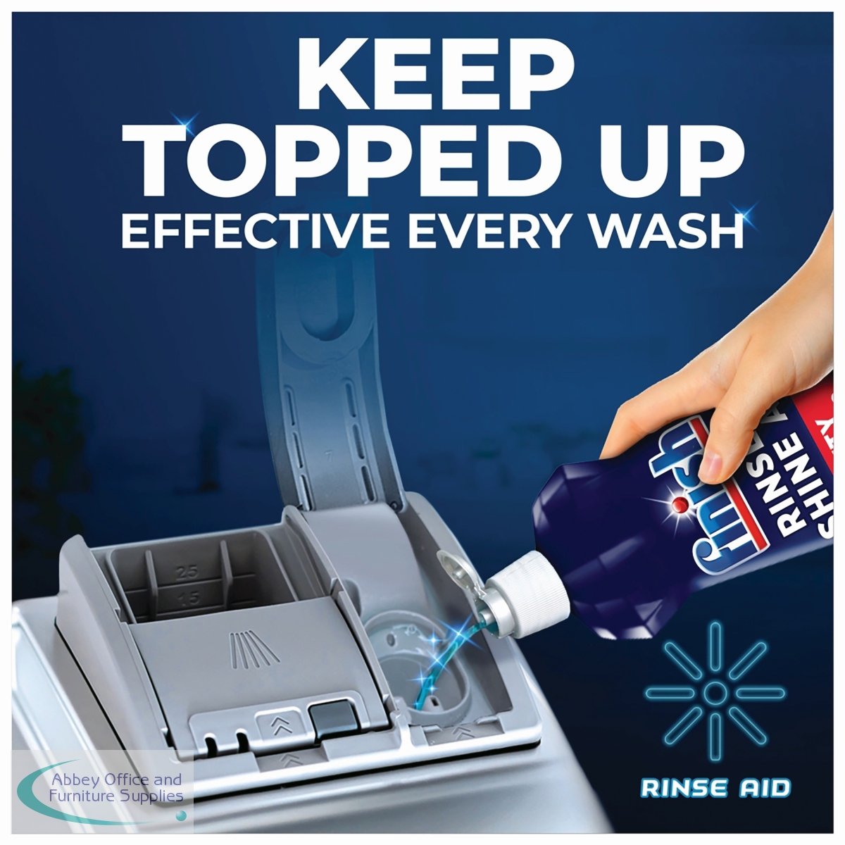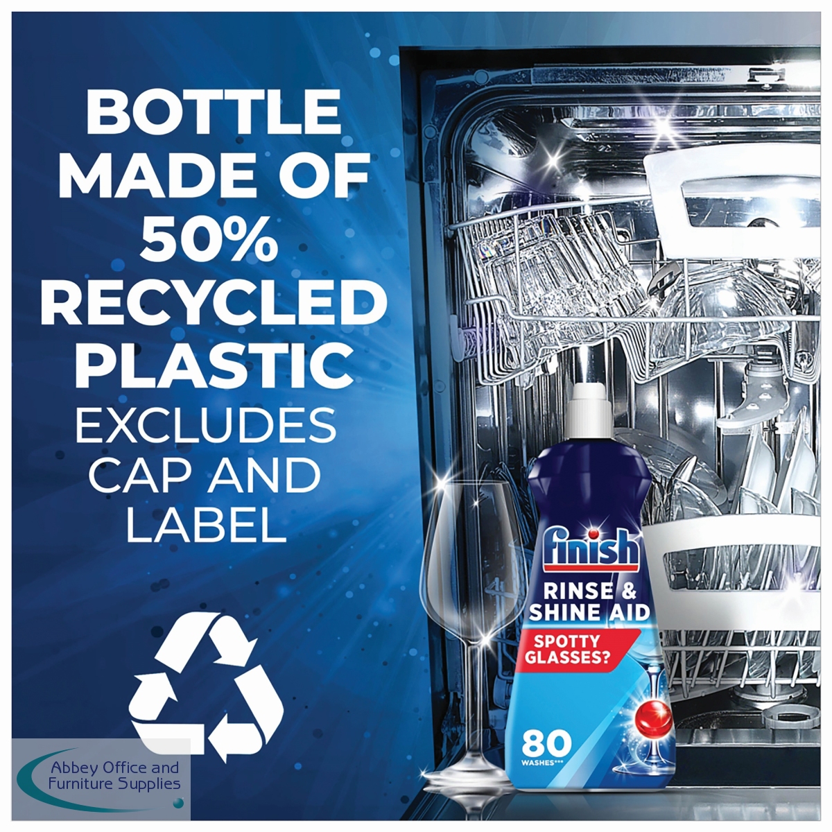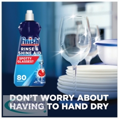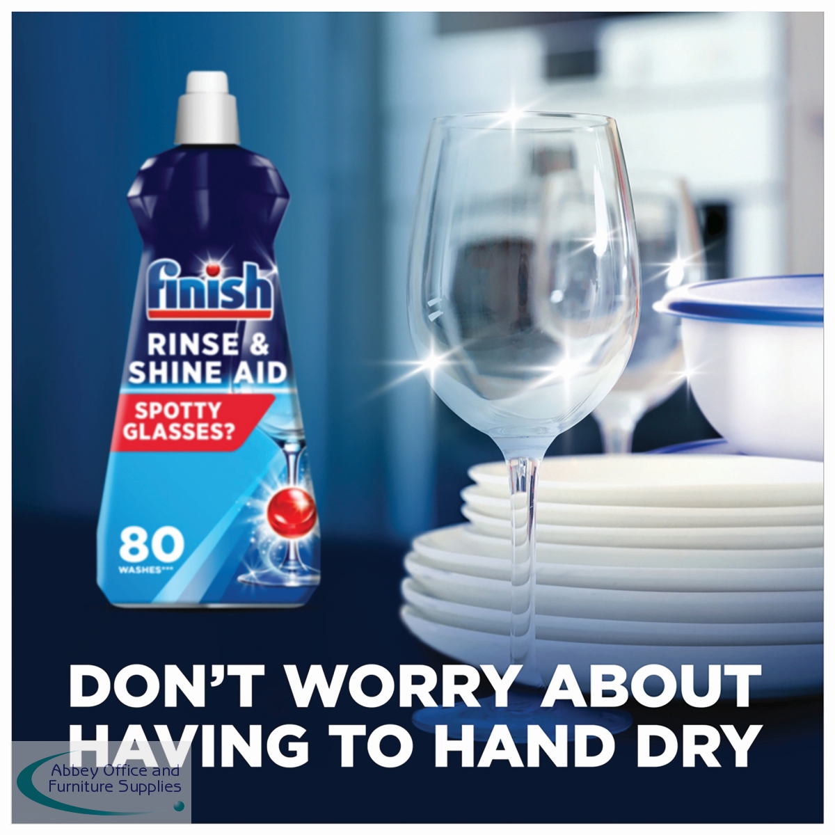 Add Finish Rinse Aid Shine and Protect to your dishwasher for shiny, dry dishes. Offering five times the power action, along with a glass protection ingredient, this rinse aid removes cloudiness, stains and spots, leaving a brilliant shine. Supplied in a 400ml bottle.