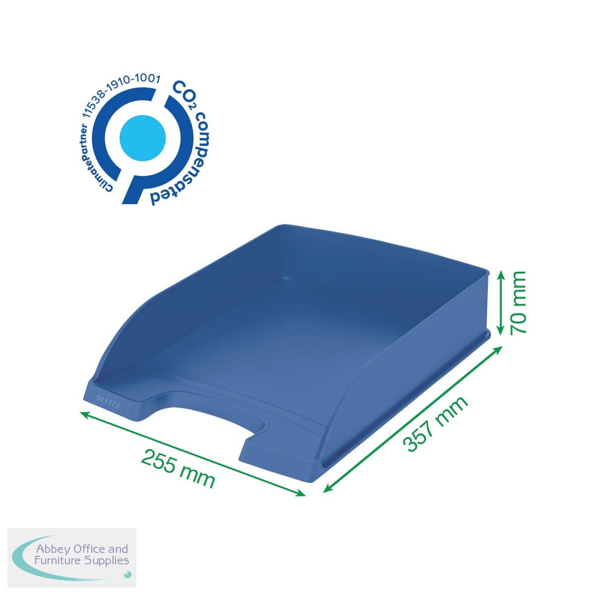 Perfect for desktop filing and organisation, this blue Leitz letter tray is made from a minimum of 90% recycled materials and is Blue Angel certified, making it the ideal choice for those wanting maximum sustainability within their office supplies. The high quality and long lasting, Leitz Recycle range is a winner of bluedot Design Award 2021 for the impressive environmental focus at the root of the design. Supplied in blue, this A4 letter tray measures W255 x D357 x H70mm.