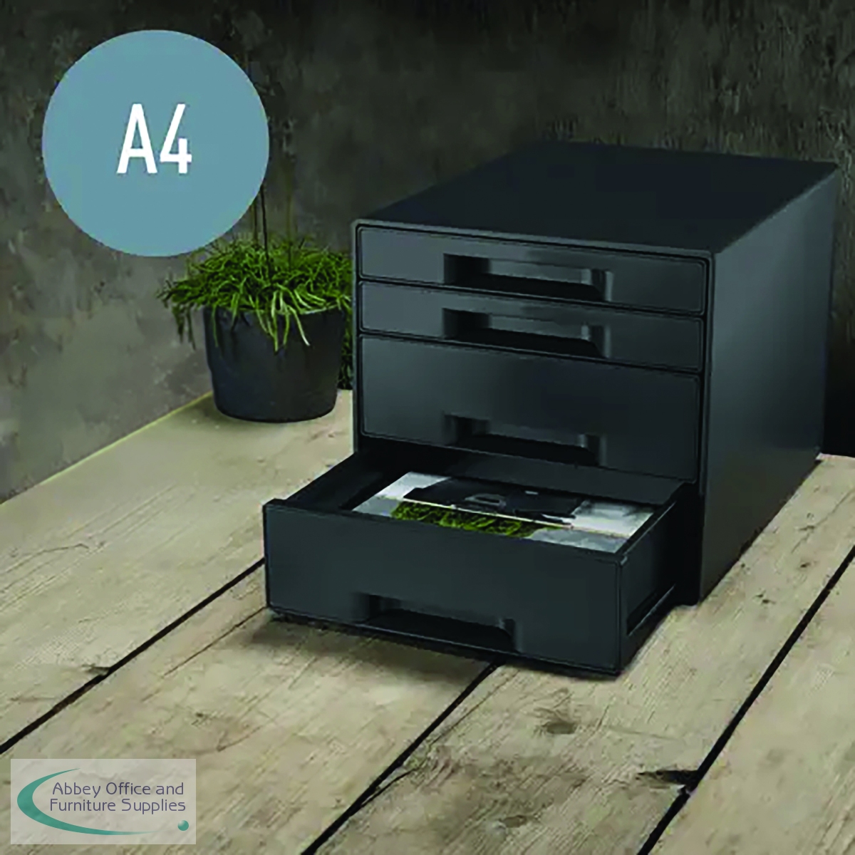 The Leitz Recycle 4 Drawer Cabinet is made min. 90% post consumer recycled plastic suitable for A4 Maxi in striking and stylish matt finish. 100% recyclable and with Blue Angel environmental certification. With the eco friendly Recycle range from Leitz you can both improve your office environment – and the environment of our planet.