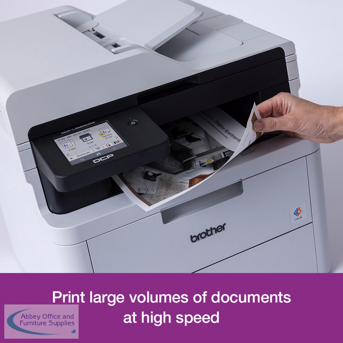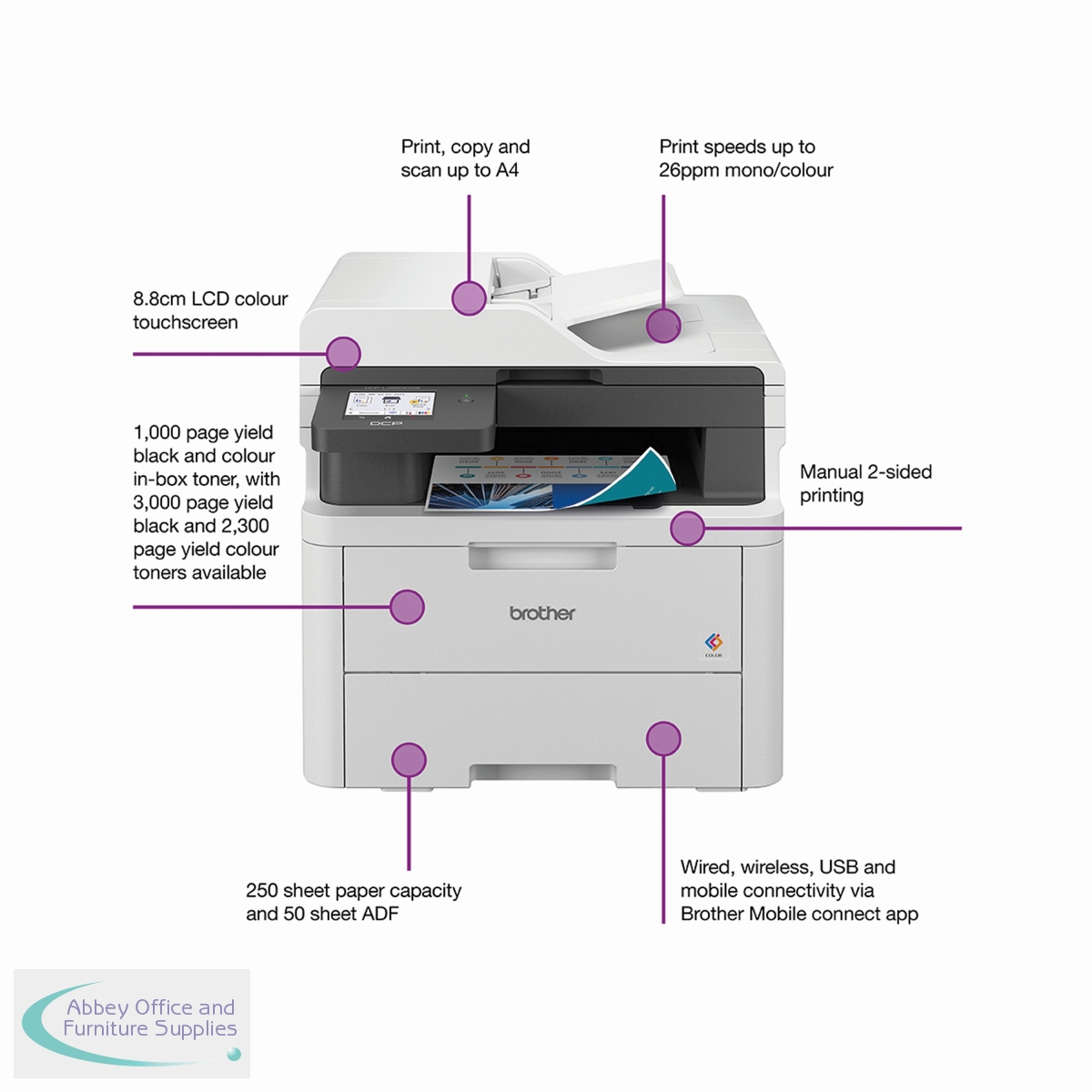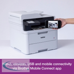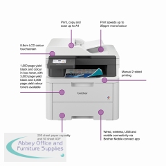 Brother colour LED printers are expertly engineered to help boost productivity in your home or small office. The Brother DCP-L3560CDW A4 colour LED multi-function printer can print, copy and scan. Providing excellent quality and fast print and copy speeds of up to 26 ppm mono/colour. With a scan resolution of up to 1200 x 1200 dpi (mono and colour), able to scan up to 27 ipm mono/21 ipm colour, with scan resolution from ADF of up to 600 x 600 dpi, includes Scan to email, image, OCR, file, FTP, network folder (Windows only), SharePoint. Designed to be quiet, with a user-friendly interface, ready to begin printing straight out of the box. This printer utilises LED technology to produce professional quality colour prints, adding impact to those important documents. With an internal memory of 512MB of direct data to easily process your documents. Secure by design, it uses triple-layer security at a device, network and document level, with the latest industry-standard security features to securely protect your data, maintaining the integrity of your data at every step. Connect with Gigabit Ethernet, Hi-Speed USB 2.0, Wireless 2.4 and 5GHz with Wi-Fi Direct and Mobile printing via Mobile Connect, Brother Print Services Plug-in, AirPrint, Mopria, Brother apps and WebConnect. Manual 2-sided printing. A generous 250 sheet paper tray capacity 50 sheet ADF and a manual feed single sheet slot. All controlled via an 8.8cm colour touchscreen. Supplied with a 1,000 page yield black and colour in-box toner.