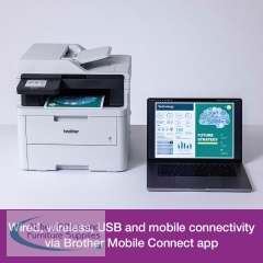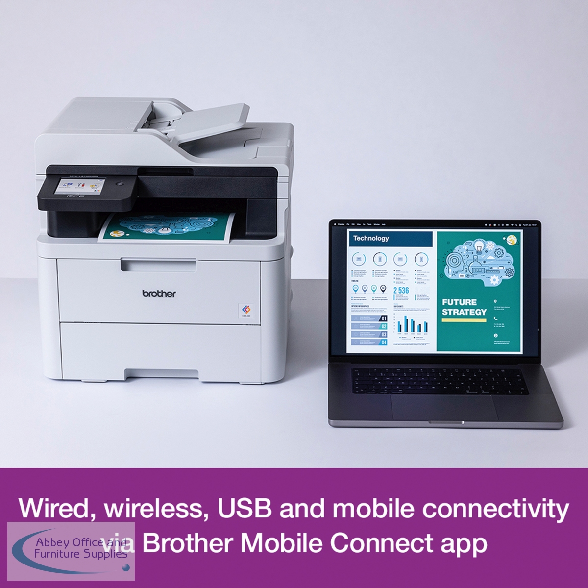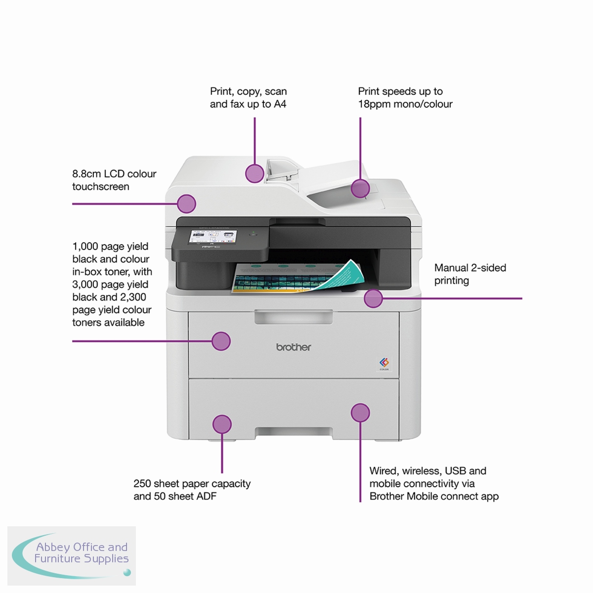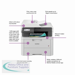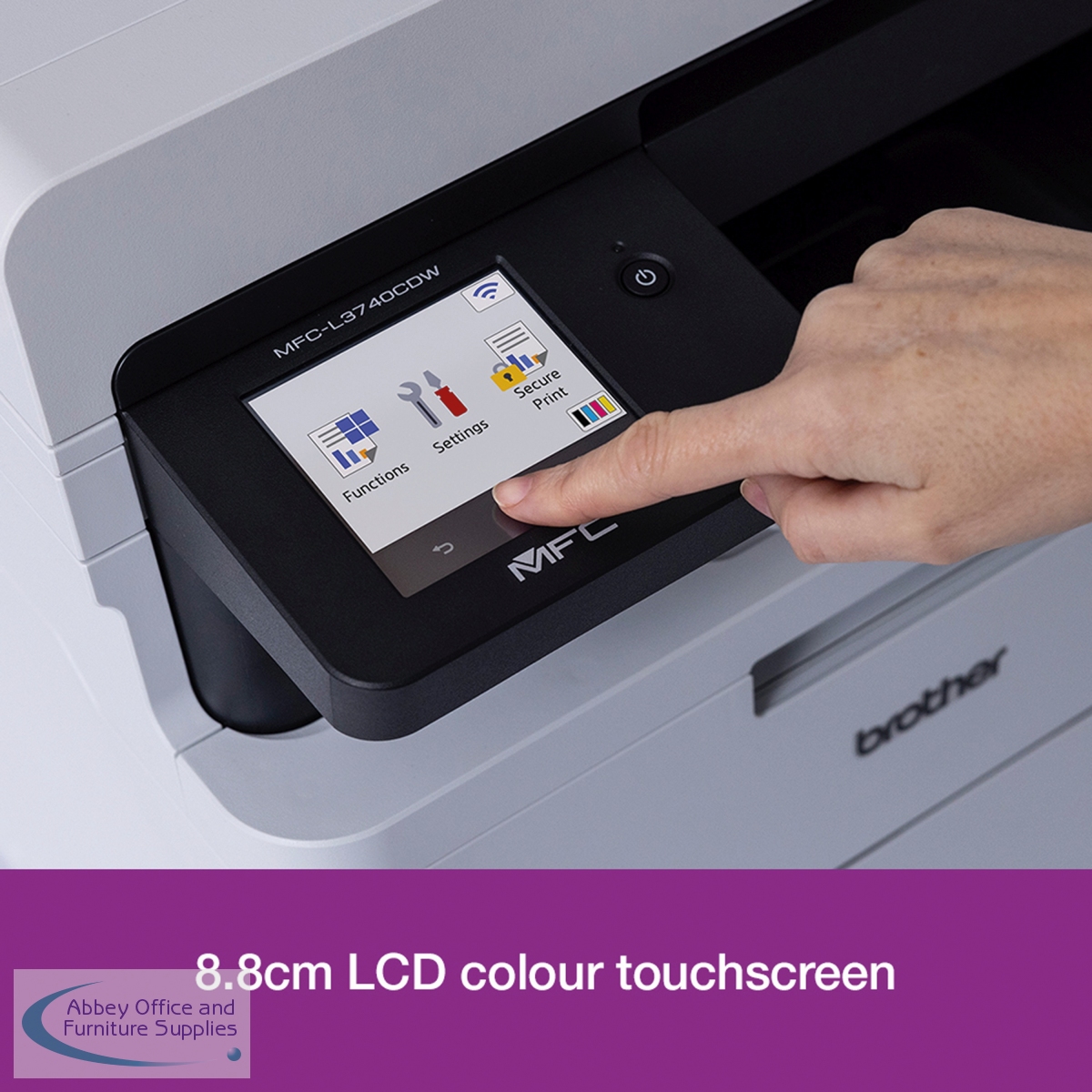 Brother colour LED printers are expertly engineered to help boost productivity in your home or small office. The Brother MFC-L3740CDW A4 colour LED multi-function printer can print, copy, scan and fax. Providing excellent quality and fast print and copy speeds of up to 18 ppm mono/colour. With a scan resolution of up to 1200 x 1200 dpi (mono and colour), able to scan up to 27 ipm mono/21 ipm colour, includes Scan to email, image, OCR, file, FTP, network folder (Windows only), SharePoint. With a 33,600 bps Super GS Fax, capable of PC Fax send and receive, and up to 350 location broadcast. Designed to be quiet, with a user-friendly interface, ready to begin printing straight out of the box. This printer utilises LED technology to produce professional quality colour prints, adding impact to those important documents. With an internal memory of 512MB of direct data to easily process your documents. Secure by design, it uses triple-layer security at a device, network and document level, with the latest industry-standard security features to securely protect your data, maintaining the integrity of your data at every step. Connect with Gigabit Ethernet, Hi-Speed USB 2.0, Wireless 2.4 and 5GHz with Wi-Fi Direct and Mobile printing via Mobile Connect, Brother Print Services Plug-in, AirPrint, Mopria, Brother apps and WebConnect. Manual 2-sided printing. A generous 250 sheet paper tray capacity 50 sheet ADF and a manual feed single sheet slot. All controlled via an 8.8cm colour touchscreen. Supplied with a 1,000 page yield black and colour in-box toner.