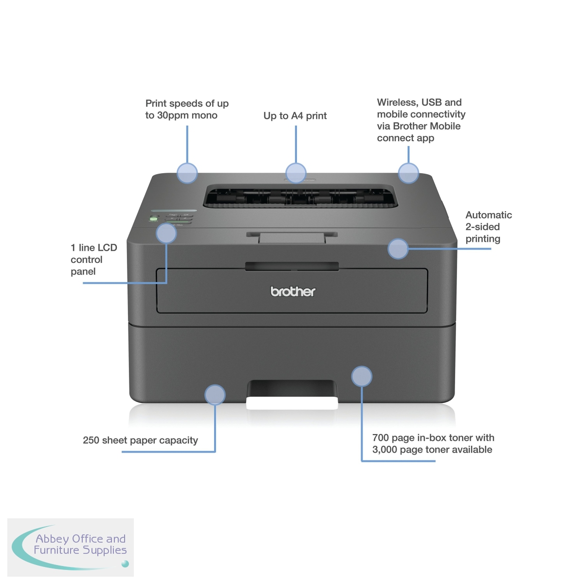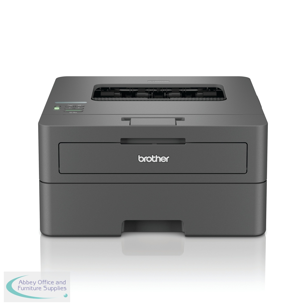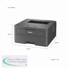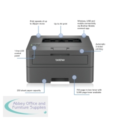Work smarter from anywhere at home or in the office with the easily connected Brother HL-L2400DW mono A4 laser printer. With a 64MB memory. The HL-L2400DW provides a range of robust features. It uses triple-layer security at a device, network and document level, for peace of mind and guarantees that the integrity of your data is maintained. Hosting a range of efficiency-boosting features, this mono laser printer saves you time with fast flawless printing, automatic 2-sided print of up to 15 sides per minute and a generous 250 sheet paper tray capacity. Print speed of up to 30 ppm. A quiet mode to reduce the printing noise. Connect with Hi-Speed USB 2.0, Wireless, Wi-Fi Direct. Mobile and Web connectivity: Brother Mobile Connect, Brother Print Service Plugin, Mopria (Android), Brother Mobile Connect (iPad/iphone), Apple AirPrint. A quiet mode to reduce the printing noise. All controlled via a 1 line LCD with keys. Supplied with a 700 page yield toner.