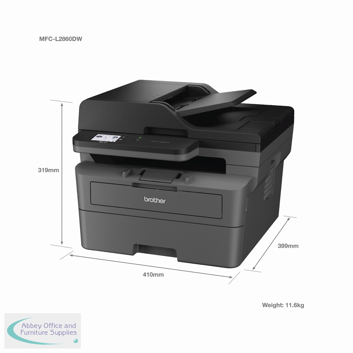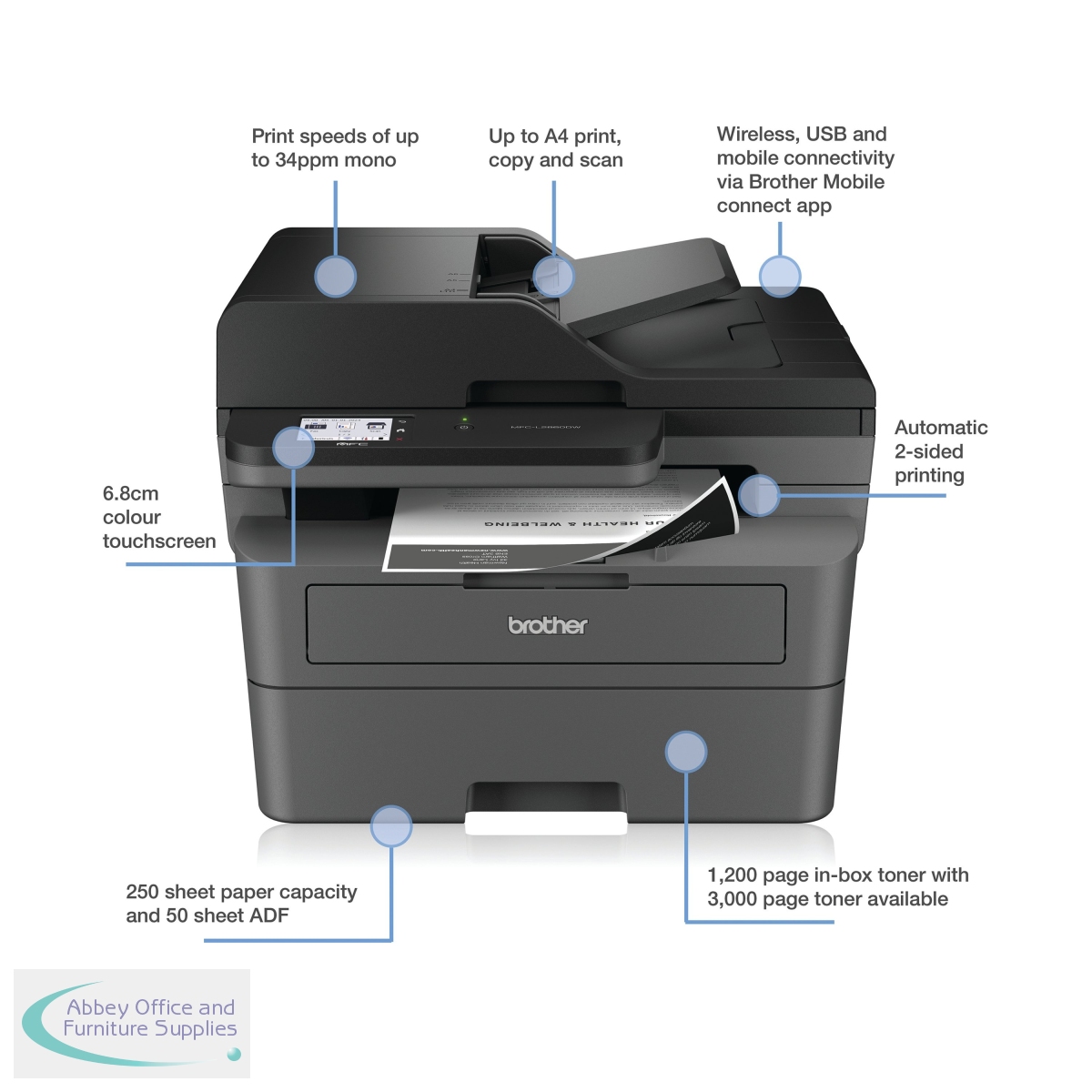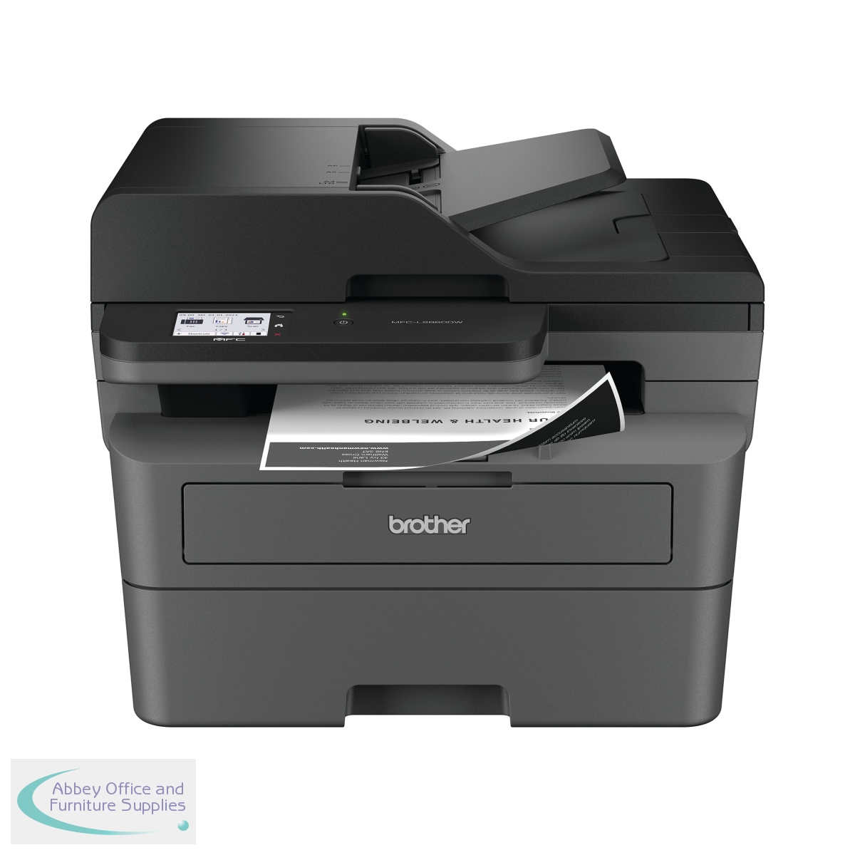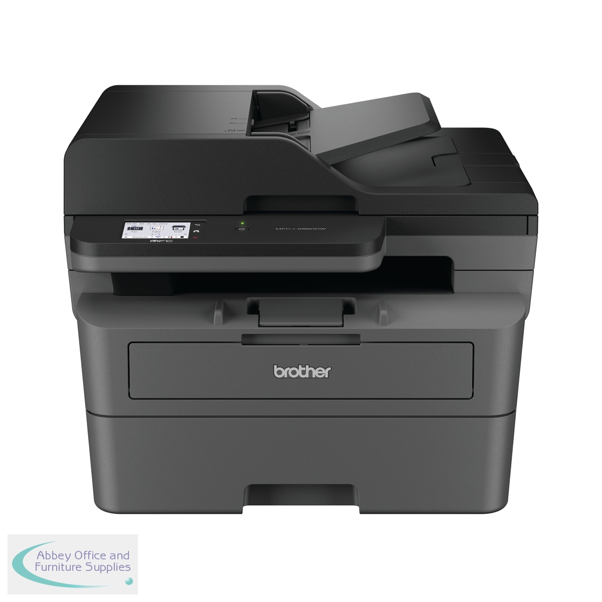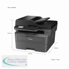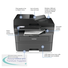 Work smarter from anywhere at home or in the office with the easily connected Brother MFC-L2860DW mono A4 all-in-1 laser printer. With a 256MB internal memory. Secure by design, it uses triple-layer security at a device, network and document level, for peace of mind and guarantees that the integrity of your data is maintained. Hosting a range of efficiency-boosting features, this all-in-1 mono laser printer saves you time with fast flawless printing and quick scan speeds, automatic 2-sided print, ADF and a generous 250 sheet paper tray capacity. 1-sided printing and copying of up to 34 copies per minute, with a resolution of up to 1200 x 1200 dpi (printing) 600 x 600 dpi (copying). The contact image sensor (CIS) scanner provides colour and mono scanning, 1200 x 1200 dpi. Fax modem with 33,600bps (Super G3), send the same fax message to up to 250 locations, a memory transmission of up to 500 pages. Connect with Hi-Speed USB 2.0, Wireless, Wi-Fi Direct. Mobile and Web connectivity: Brother Mobile Connect, Brother Print Service Plugin, Mopria (Android), Brother Mobile Connect (iPad/iphone), Apple AirPrint, Web Connect. A quiet mode to reduce the printing noise. All controlled via a 6.8mm LCD touchscreen control panel. Supplied with an in-box toner with a page yield of up to 1,200 pages (black).