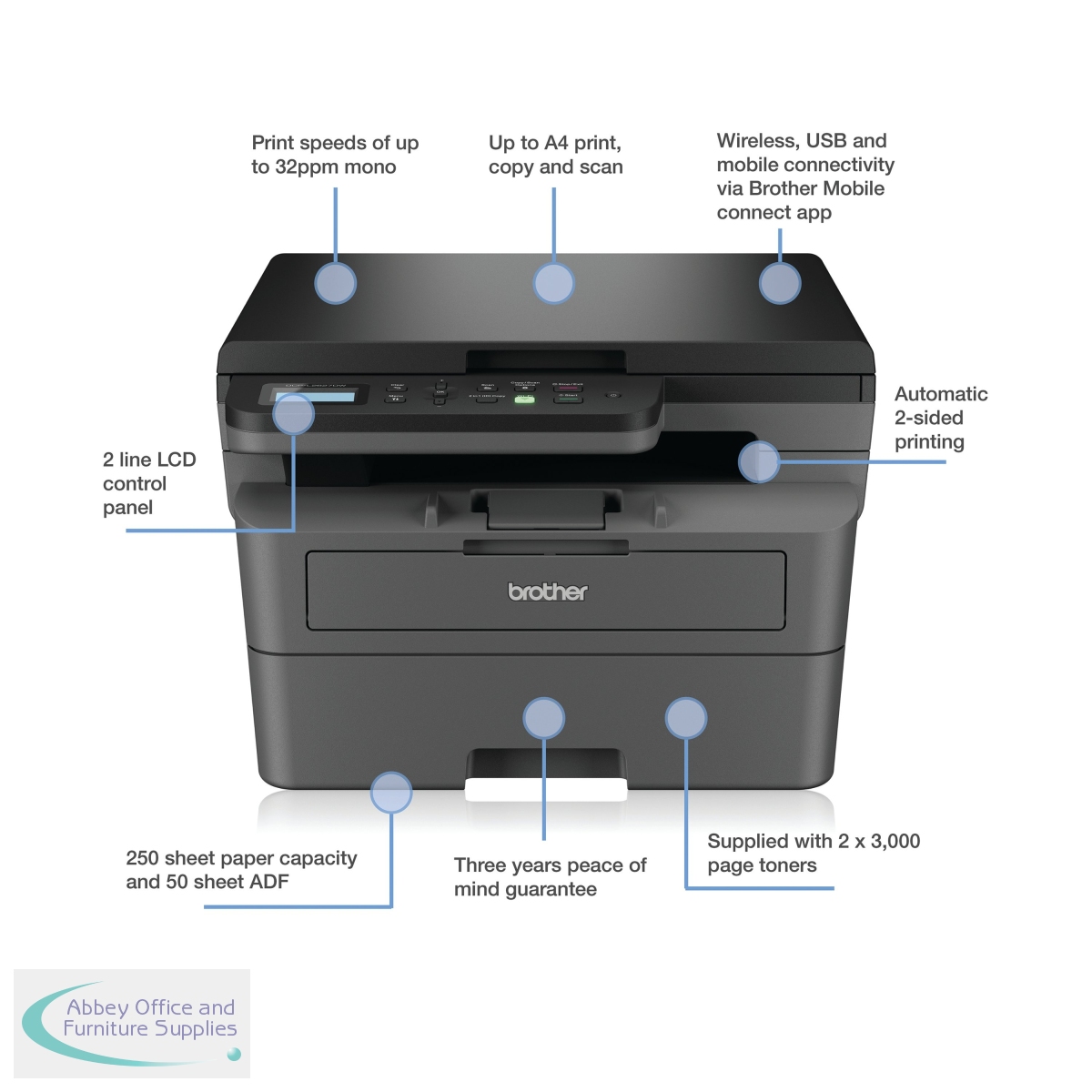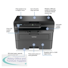 Work smarter from anywhere at home or in the office with the easily connected Brother DCP-L2627DWXL mono A4 3-in-1 laser printer. Supplied the all in box print bundle: 6,000 toner prints (2 x 3,000 page high yield toner cartridges) and a 3-year peace of mind guarantee. With a 128MB internal memory. Secure by design, it uses triple-layer security at a device, network and document level, for peace of mind and guarantees that the integrity of your data is maintained. Hosting a range of efficiency-boosting features, this 3-in-1 mono laser printer saves you time with fast flawless printing, copying and quick scan speeds. 1-sided copying and printing of up to 32 copies per minute, with a resolution of up to 600 x 600 dpi (copying), 1200 x 1200 dpi (printing). Automatic 2-sided printing and a generous 250 sheet paper tray capacity. The contact image sensor (CIS) scanner provides colour and mono scanning, 1200 x 1200dpi resolution. Connect with Hi-Speed USB 2.0, Wireless, Wi-Fi Direct. Mobile and Web connectivity: Brother Mobile Connect, Brother Print Service Plugin, Mopria (Android), Brother Mobile Connect (iPad/iphone), Apple AirPrint. A quiet mode to reduce the printing noise. All controlled via a 2 line LCD with keys control panel.