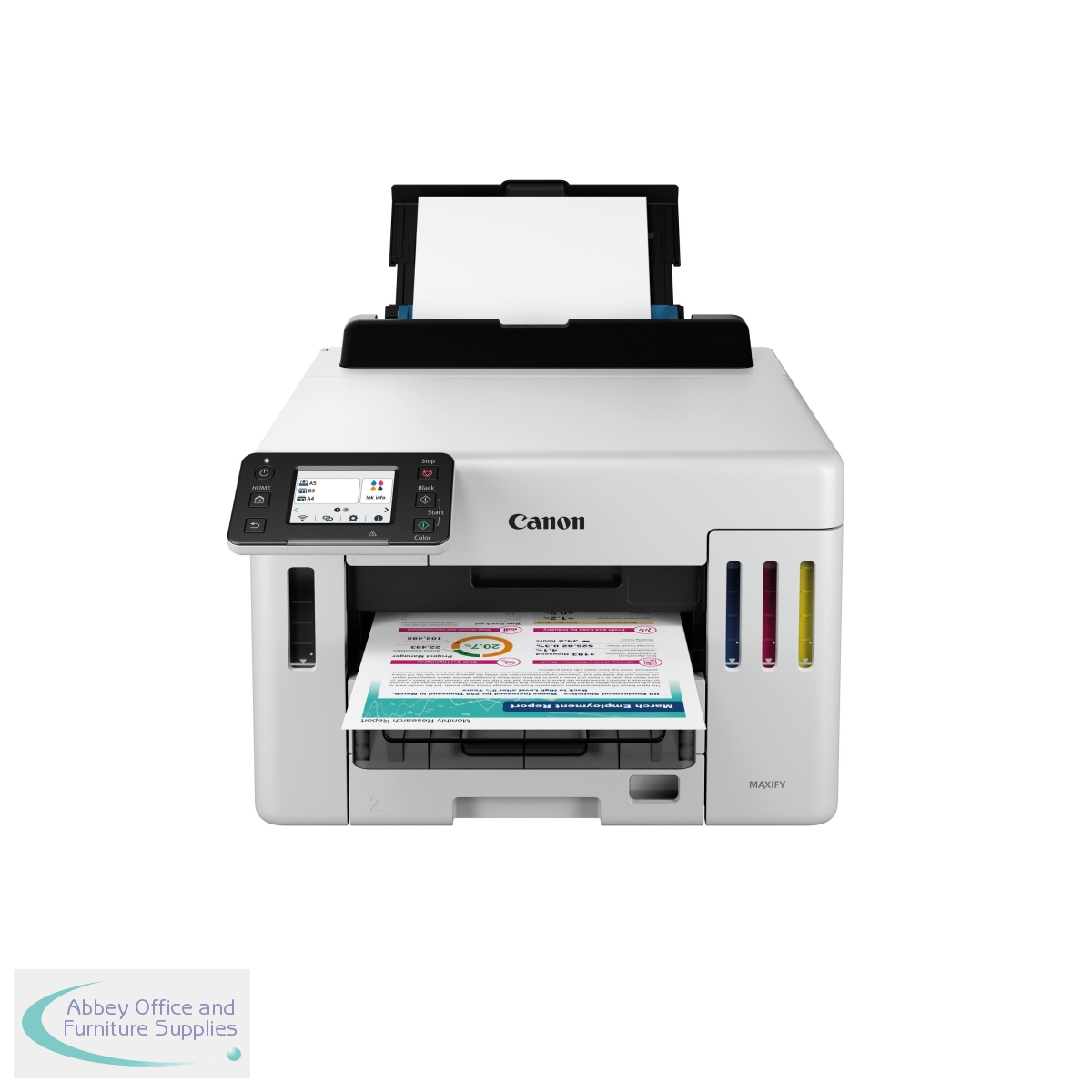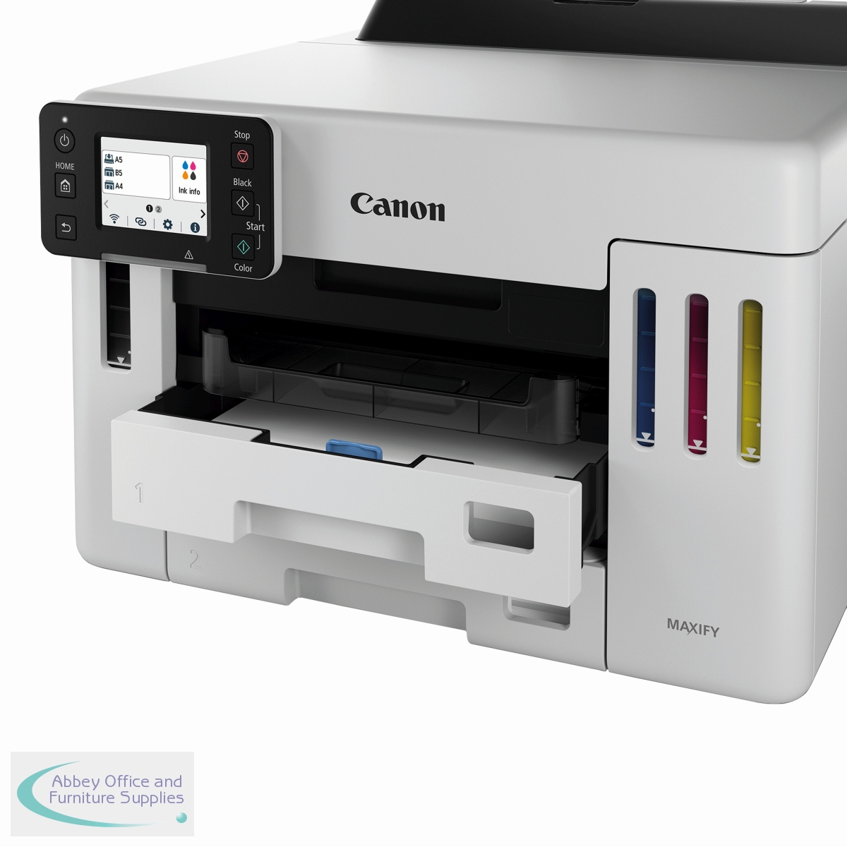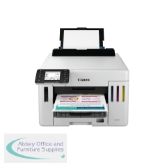 Meet your business needs nd enjoy advanced media handling, low running costs and enhanced security, all in a compact and user-friendly design. Canon MAXIFY GX5550 handles a diverse range of media and featuring a high-capacity ink tank, this printer boosts the productivity and versatility of your business. Prints a variety of high-quality documents, labels and envelopes on a range of paper weights, ideal for retail, logistics and pharmacy environments. Benefit from fast print speeds and high yields thanks to its four individually refillable ink tanks and affordable ink bottle replacements. This printer is a single-function printer. Keep your most important data safe with simple, easy-to-navigate security settings that can be tailored to your environment. With a print speed of up to 24.0 ipm (mono), 15.5 ipm (colour). Print resolution up to 600 x 1,200 dpi. Auto 2-sided printing (A4, Letter - plain paper/cassette only). Includes 2 cassettes at the front, each with 250 sheet capacity, and a rear tray with a 100 sheet capacity. Connectivity via USB, dual band Wi-Fi and Ethernet. Mobile connectivity: Canon PRINT Inkjet/SELPHY app, Easy-PhotoPrint Editor app, Creative Park app. Printer features: Easy-PhotoPrint Editor Software, PIXMA Cloud Link, Canon Print Service Plugin and Mopria (Android), Apple AirPrint, Wireless Direct, Easy Layout Editor. All operated via a 6.7cm colour touchscreen. Supplied with 4 high yield ink bottles GI-56 (1x Black and 1 x Cyan, Magenta and Yellow).