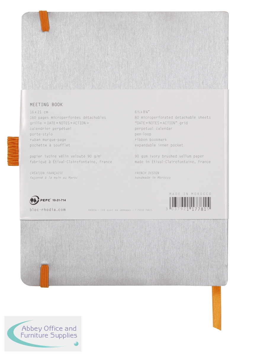 The Rhodiarama meeting book is the perfect accompaniment for all meeting needs. This A5+ meeting book features an Italian leatherette soft cover and 80 detachable, 90gsm bushed vellum sheets, with a 'date - notes - action' layout. Supplied in silver.
