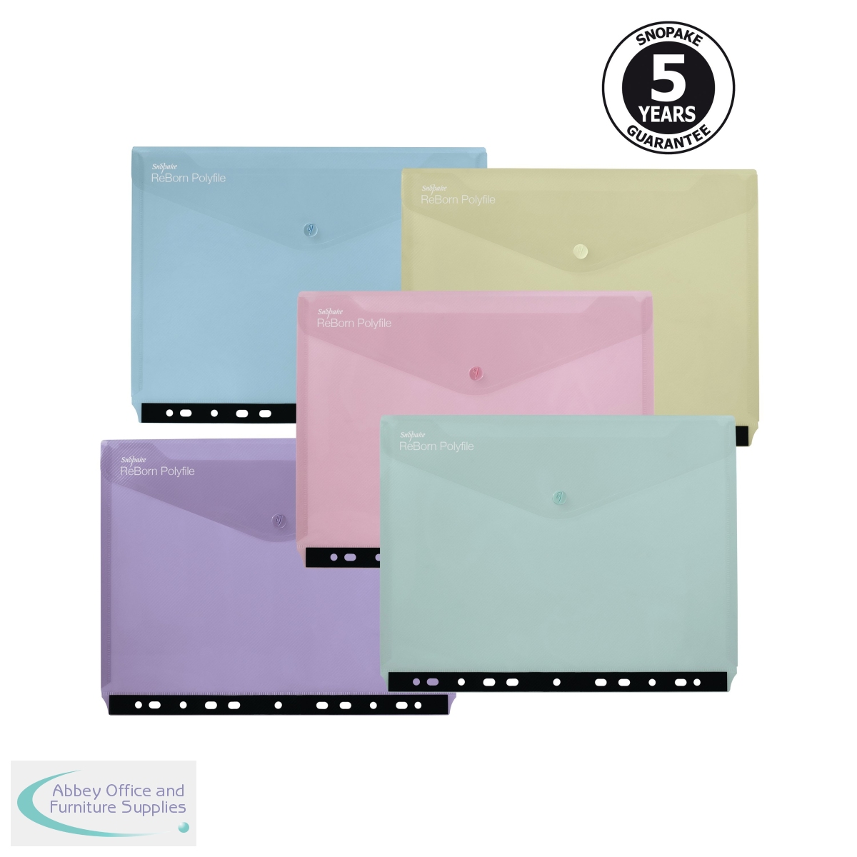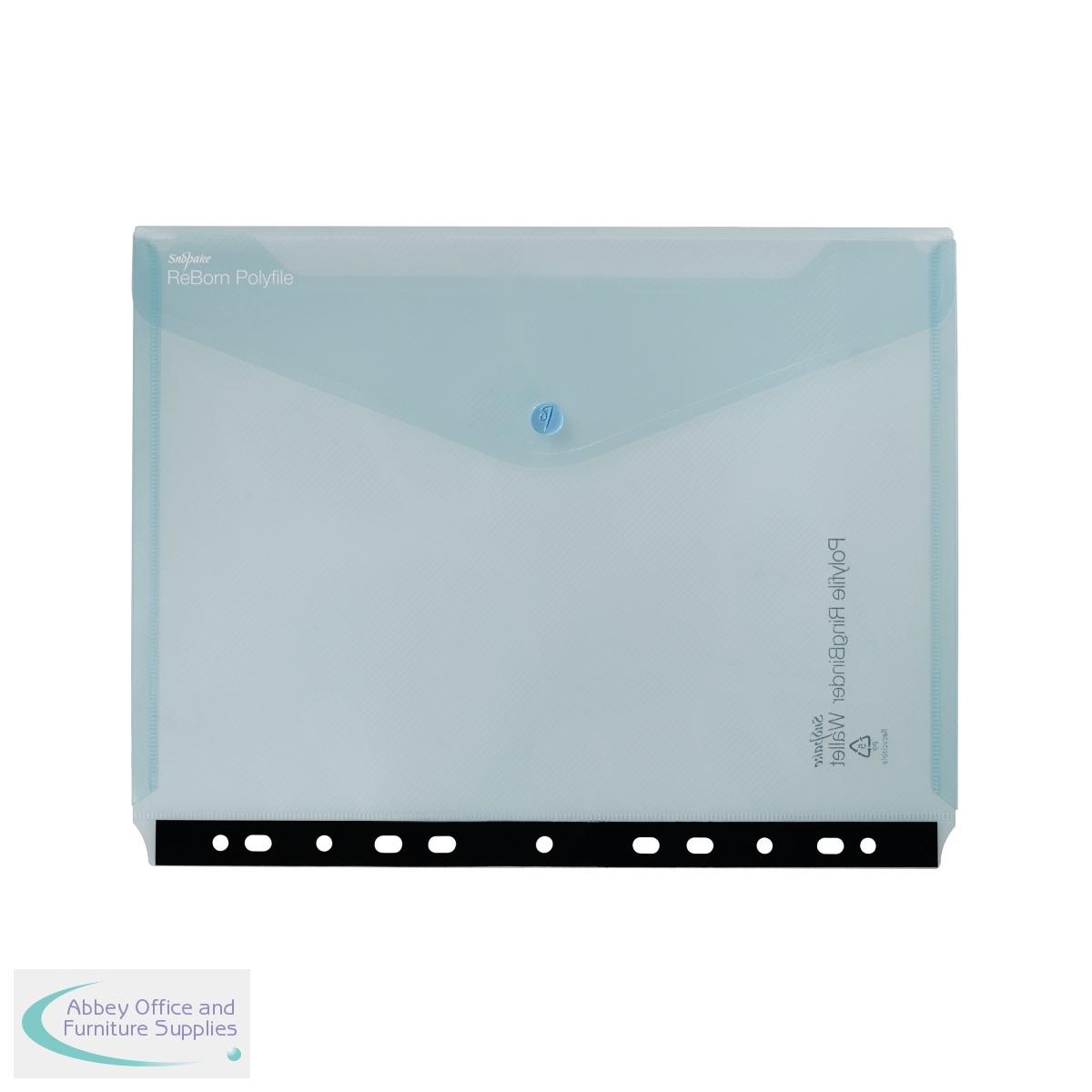The Snopake Reborn Universal Ring Binder polyfile Wallet in foolscap size with superline embossed finish, ideal for unpunched filing and storing loose papers. Snopake ReBorn is made from 100% recycled, heavy-gauge and tough polypropylene, the responsible and eco-friendly choice. Multi-punched reinforced edge suits most binding mechanisms, so is perfect for use in all ring binders and lever arch files. Resourceful document wallet in soft pastel hues allows you to easily and quickly identify and retrieve contents for an organised, efficient and hassle-free filing experience. Wallet is secured by a colour coordinated press-stud closure.