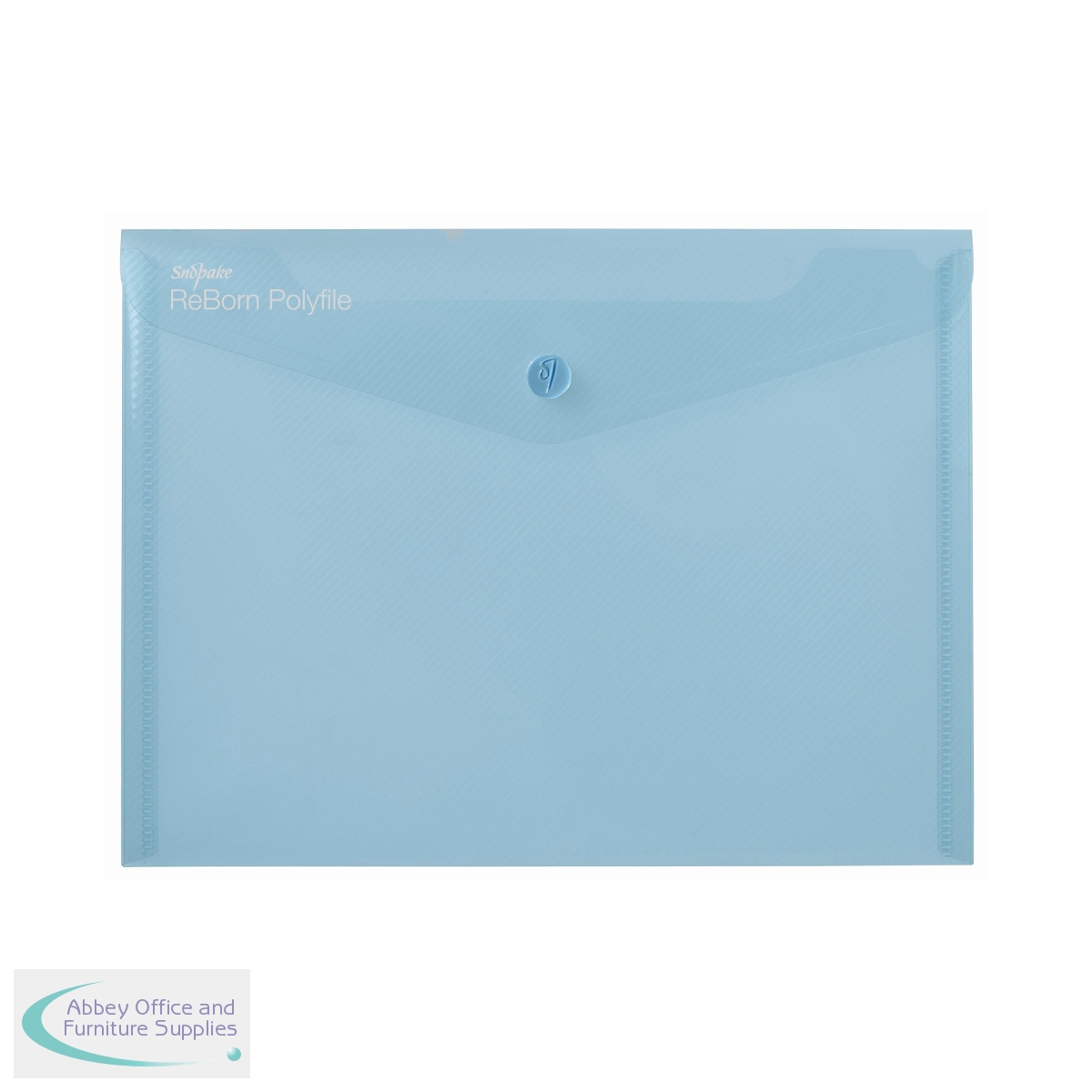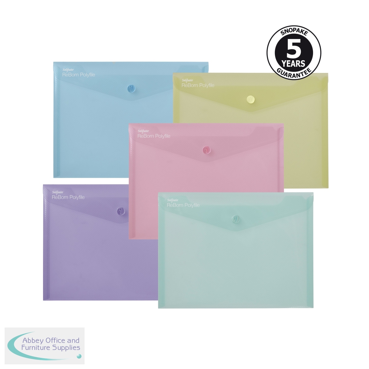 This Snopake Reborn Polyfile in A5 size is an ideal travel companion, the popper wallet is perfect for storing important travel documents like passports, tickets, money and insurance documents in this water-resistant wipe-clean folder. Can hold up to 75 sheets of paper. Snopake ReBorn is made from 100% recycled, heavy-gauge and tough polypropylene, the responsible and eco-friendly choice. with a 5 year guarantee. The attractive transparent superline finish in soft pastel hues, is ideal for quick and easy identification of contents, secured by a colour coordinated press-stud closure.