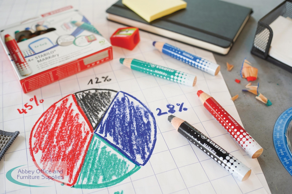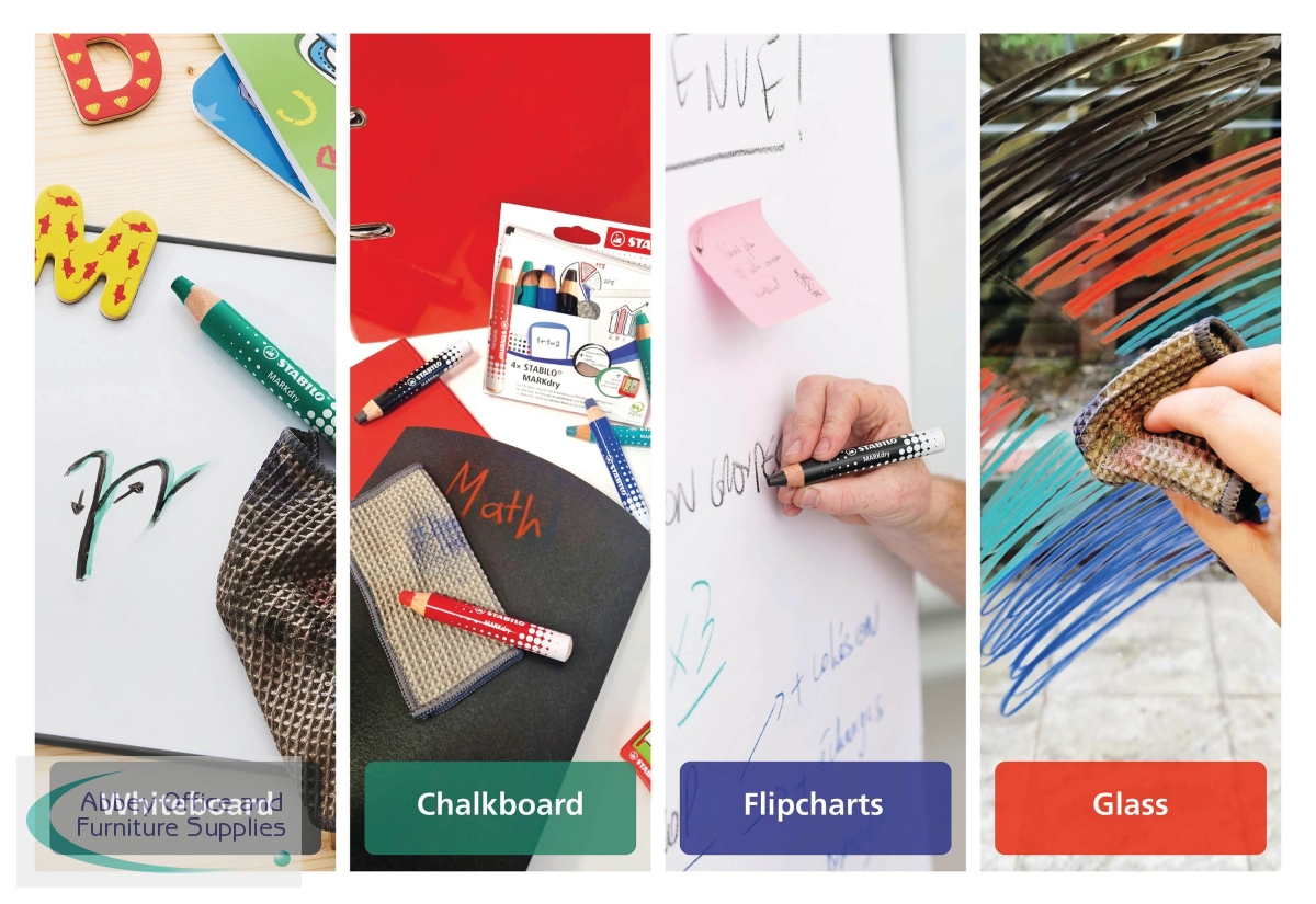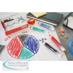 The Stabilo Markdry marker pencil is ideal for use on whiteboards, chalkboards, show me boards, glass and flipcharts. Easily erased with a damp or dry cloth on non-porous surfaces or washed off hands and clothes, these sustainable pencils with odourless and solvent-free lead last up to five times longer than a liquid whiteboard marker. This pack includes five Markdry pencils in black.