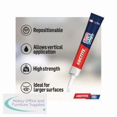 Formulated with cyanoacrylate rubber-infused gel formula, this Loctite Super Glue Power Gel allows powerful bonds that are extremely precise even on vertical surfaces and materials that require high flexibility. Ideal for repairs at home, being repositionable for up to 60 seconds, it will repair larger surfaces without clamping. This works on a variety of materials from wood, rubber, plastic and more, including leather. Withstanding strong conditions and shock resistant, it serves as a waterproof glue and a heatproof glue. Supplied in a 20g tube.