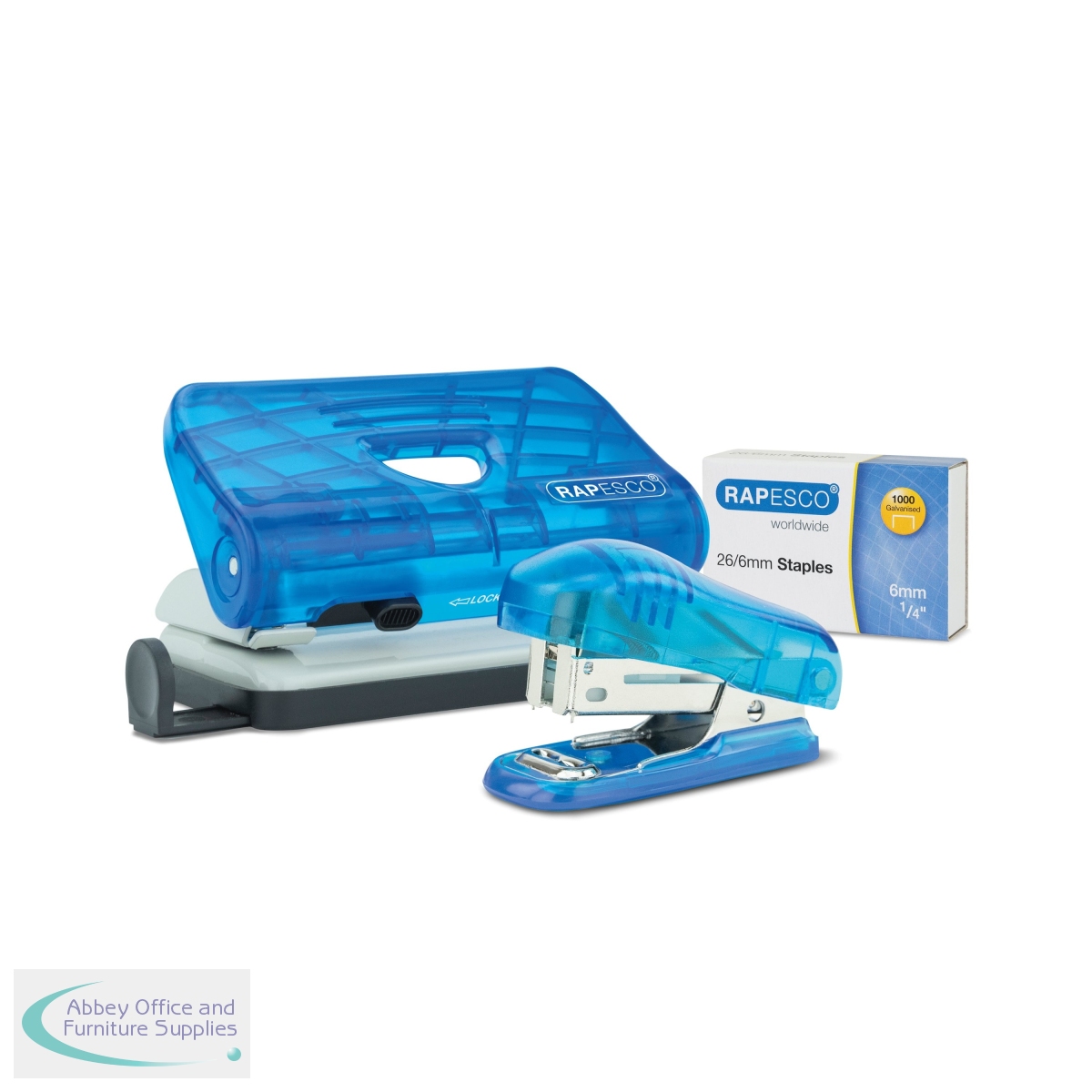 HT04037 - Rapesco 2 Hole Punch Mini Stapler and 26/6mm Staples Set Transparent Blue