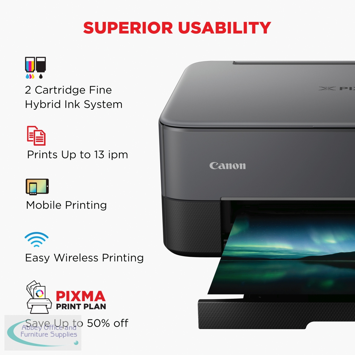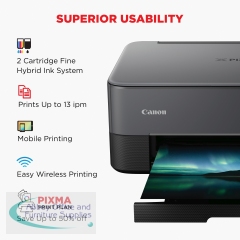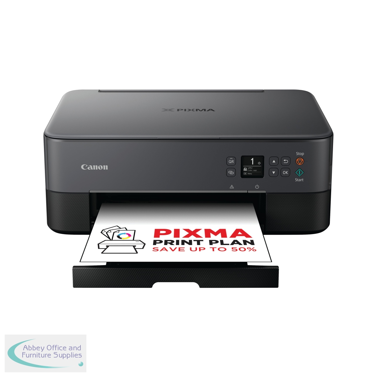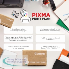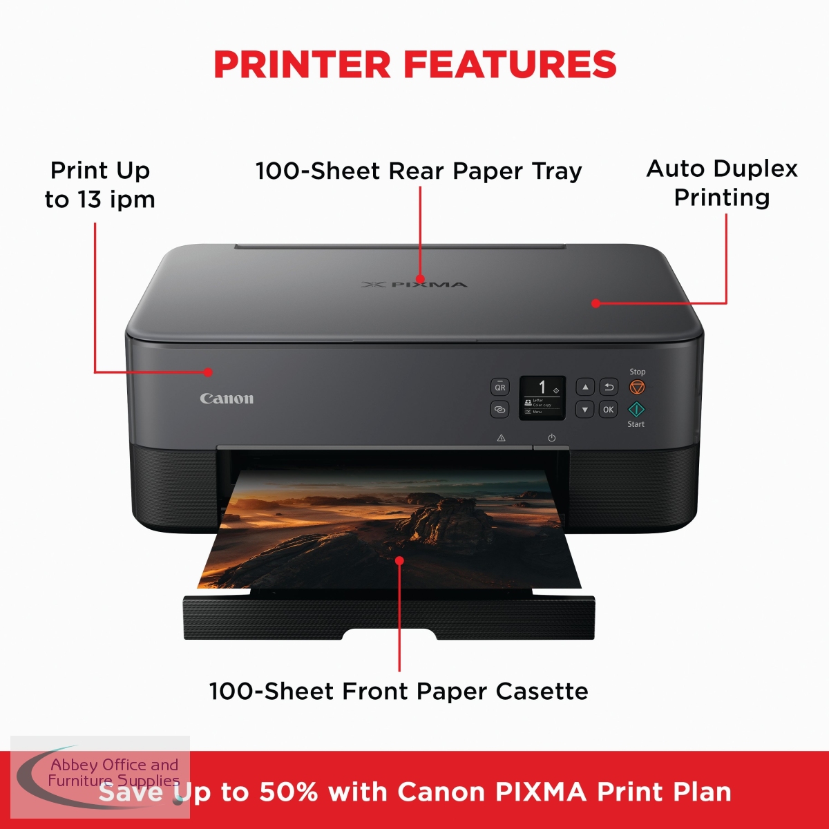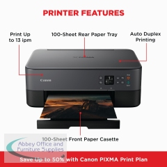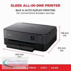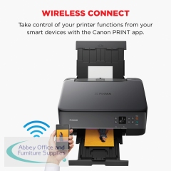 This Canon PIXMA TS5350i 3-In-One can print, copy and scan, with a contemporary 2-tone design with an LED status bar, making it an ideal match for modern creatives. Let loose your ambitions and get designing with Easy-PhotoPrint Editor, or try paper crafts from Creative Park. Features a print speed of up to 13.0 ipm (mono) and 4.4 ipm (colour) with a 4800 x 1200 dpi print resolution. A copy speed of approx. 20 sec (sFCOT). Copy zoom 25 - 400%. Multiple copy of 99 copies max. The CIS flatbed colour scanner provides an optical resolution of up to 1200 x 2400 dpi. Can scan documents up to 216 x 297mm. With a scanning depth (input/output) colour RGB each 16bit/8bit and Greyscale 16bit/8bit. Connectivity interface: Hi-Speed USB (B Port), Wi-Fi IEEE802.11 b/g/n, Wi-Fi Security: WPA-PSK, WPA2-PSK, WEP, Administration password, Wireless LAN Frequency Band: 2.4GHz. Print applications and methods: Canon PRINT Inkjet/SELPHY app, Easy-PhotoPrint Editor app, Creative Park app, PIXMA Cloud Link, Canon Print Service Plugin (Android), Apple AirPrint, Wireless Direct, Access Point Mode, WLAN PictBridge, Mopria (Android). Load up the rear feed with a whole host of creative media, including iron-on transfers and double-sided matte paper, to turn your ideas into reality. Rear tray takes maximum of 20 sheets (photo paper) or 100 sheets (plain paper). Front tray takes up to maximum of 100 sheets (plain paper). Take control with your smartphone thanks to snappy wireless connectivity and print, scan and connect to your social media accounts via the Canon PRINT app - all it takes to get connected is the touch of a button thanks to Wireless Connect. For shareworthy snaps, take advantage of the FINE cartridges and ChromaLife100 ink system for vivid, long-lasting photos. This printer is compatible with the PIXMA Print Plan, a monthly subscription for inks based on pages printed. OLED (1.44 inch) display. Supplied with in-box FINE ink cartridges.