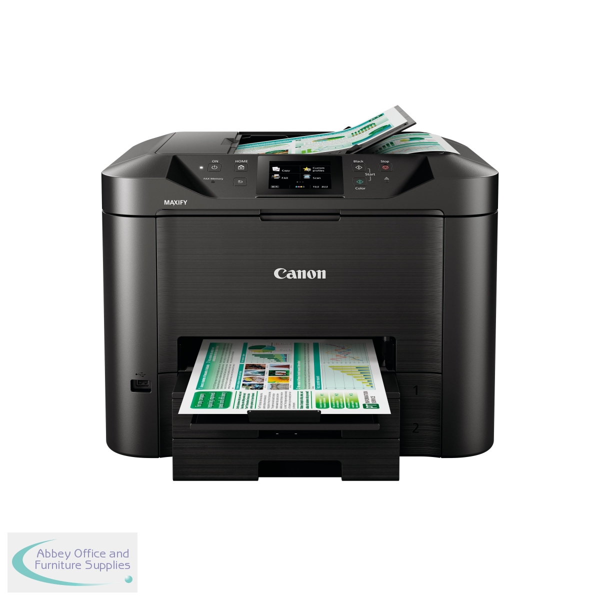 This Canon Maxify MB5450 4-in-1 inkjet colour printer offers great productivity, reliability and convenience in your small office, providing print, copy, scan and fax options. Wireless printing from mobile devices and cloud services and easy network integration. With the convenience of 500 sheet capacity paper tray. A print speed of up to 24.0 ipm mono and 15.5 ipm colour (A4). ADF copy speeds of up to 11.5 ipm (colour) and 22.0 ipm (mono). Multiple copies of up to 99 pages, reduction and enlargement of 25-400% and fit to page. with Automatic 2-sided to 2-sided duplex printing (A4, LTR, plain paper). Automatic document feed of up to 50 sheets and enables double-sided scanning and printing. Scan via a flatbed, single pass 2-sided ADF colour scanner, with an optical resolution of up to 1200 x 1200 dpi. Scan to network folder, scan to USB, to cloud or email via cloud connectivity. Print resolution up to 1200 x 600 dpi. With a fax Super G3/colour, with a resolution of up to 300 x 300 dpi (mono), 200 x 200 dpi (colour). Fax memory of up to 250 pages, coded speed dialing of up to 100 locations, and group dial of up to 99 locations. Connect with USB 2.0, Ethernet 10/100Mbps (auto switchable), USB flash memory port (A type). Wireless connections Wi-Fi IEEE802.11 g/g/n, Wireless LAN, Access Point Mode. Applications support: Canon PRINT Inkjet/SELPHY app, MAXIFY Cloud Link (from printer or smart device), Canon Print Service Plug-in (Android), Mopria, Microsoft Mobile Print, Apple AirPrint. All controlled via a 8.8cm LCD touchscreen panel. Supplied with in-box inks.