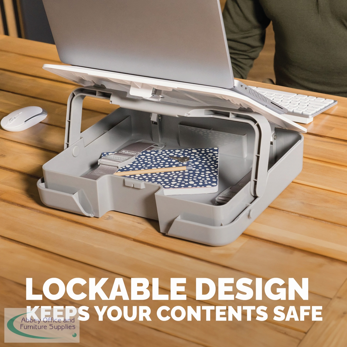 The Fellowes Breyta Laptop Carry Case is a 2 in 1 design that includes a storage/carry case and laptop riser. It has a built-in handle and optional carry strap. The riser has 5 height adjustments for ergonomic working. Portable design that is easy to set up, adjust and store away. Ideal for hybrid working.