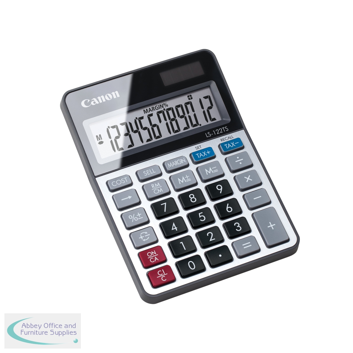 The Canon LS-122TS Desktop Calculator features a 12 digit large LCD display with functions such as tax calculations, cost-sell margin and constant calculation. The LS-122TS is solar and battery powered. It also includes a replaceable battery for added convenience.