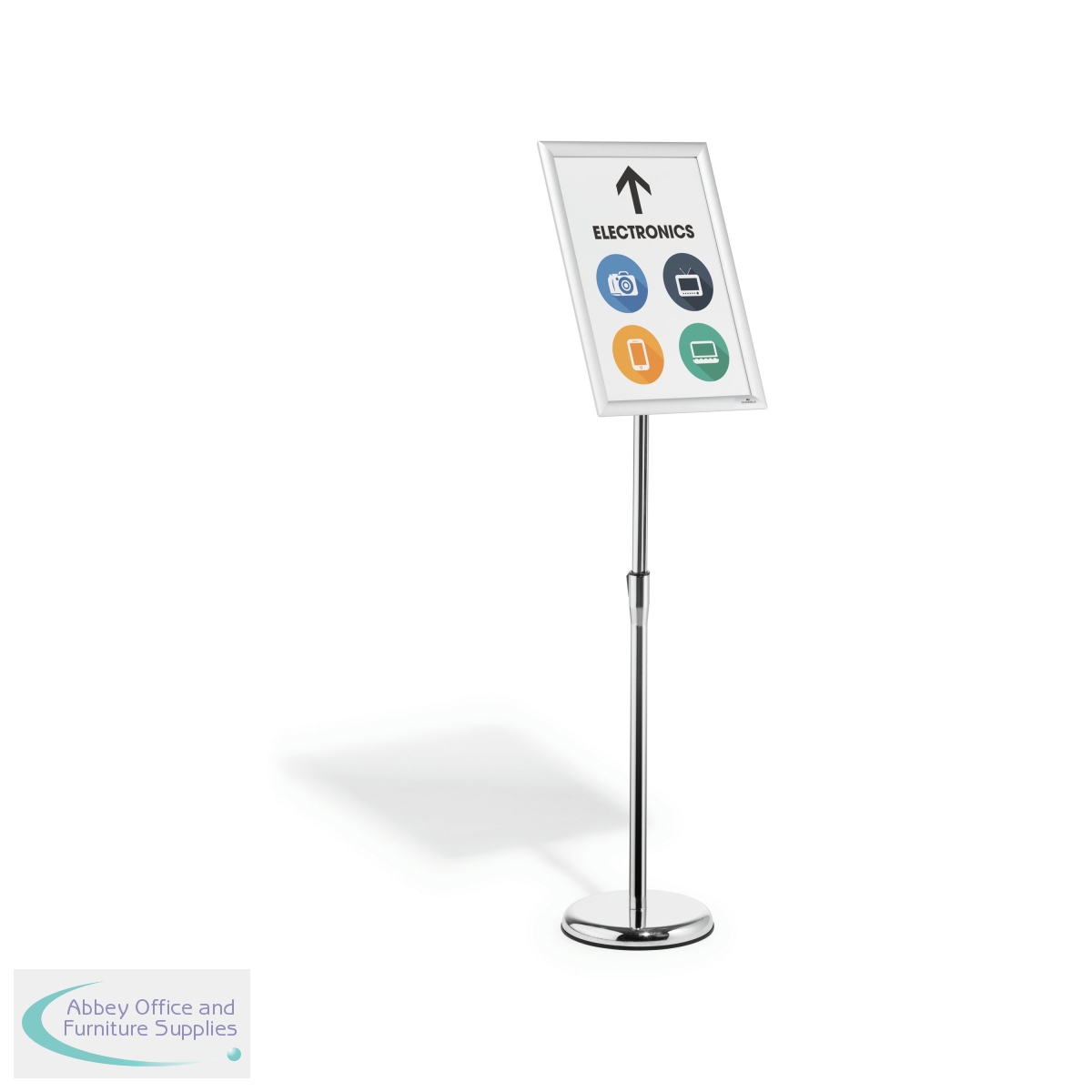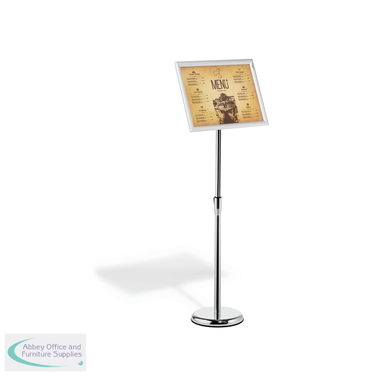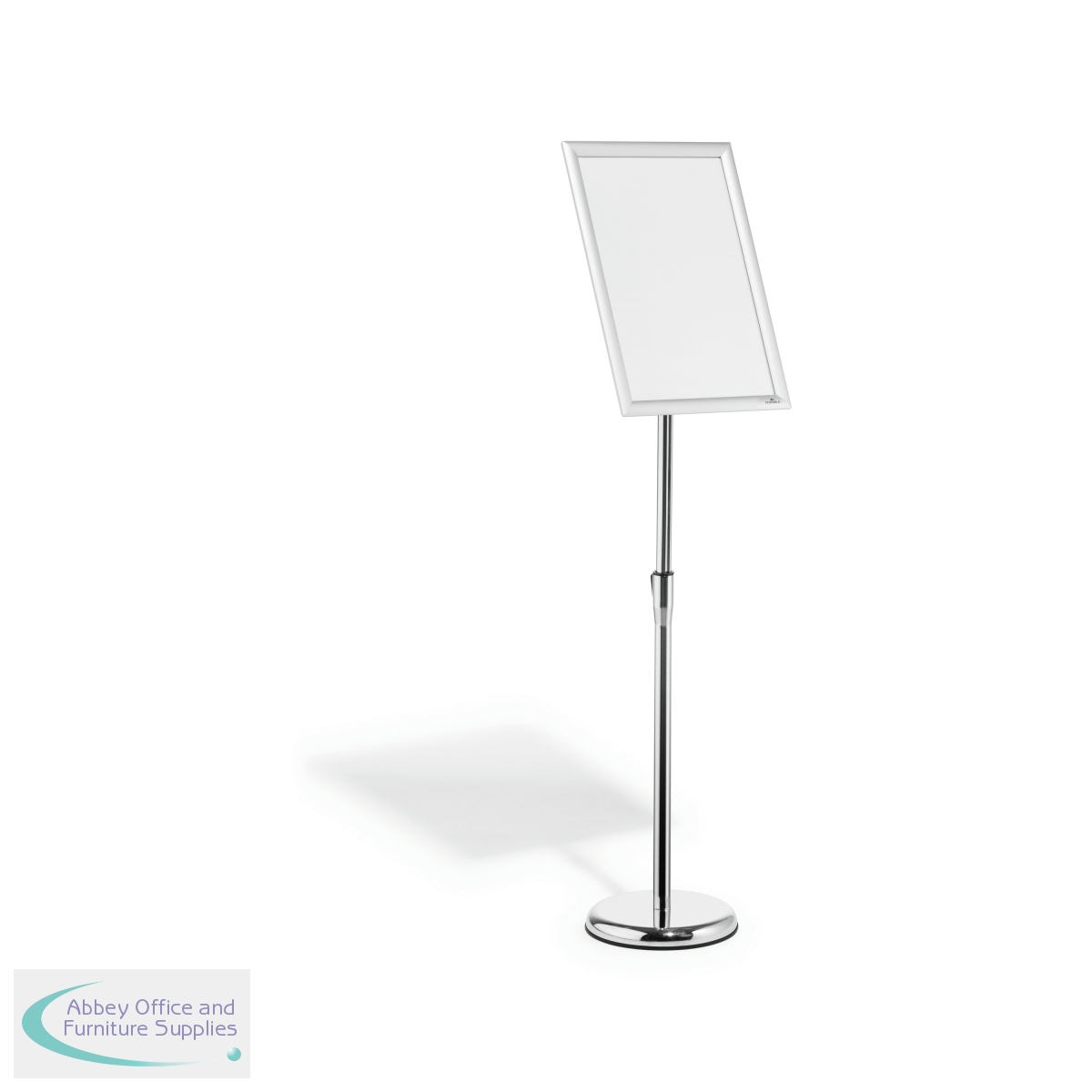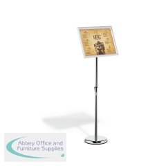 The Durable Infostand is a versatile information stand which quickly assembled with a non-scratch round base which is fillable to offer stability. The folding snap frame can be rotated from portrait to landscape format with an adjustable reading angle and content change is quick and easy. With a display area of A3, this durable floor stand is ideal for restaurants, retail, museums, exhibitions and more.