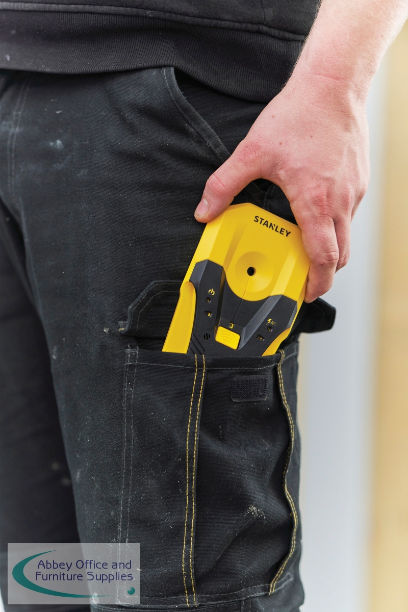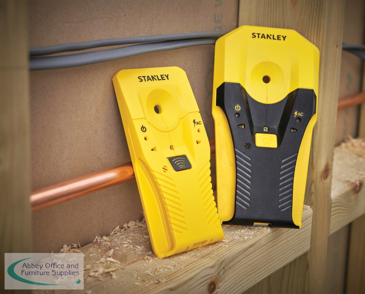 With its slim profile, the Stanley Stud Sensor is capable of detecting wood and metal studs up to 1-1/2 inches below the surface. You can expect accuracy every time thanks to its centre marking channel and auto-calibration. It indicates what it is sensing below the surface with sequential LEDs and audible beeps and is best suited to locating live wire or studs when hanging pictures or mounting a television. Powered by 2 x AAA Batteries which come included.