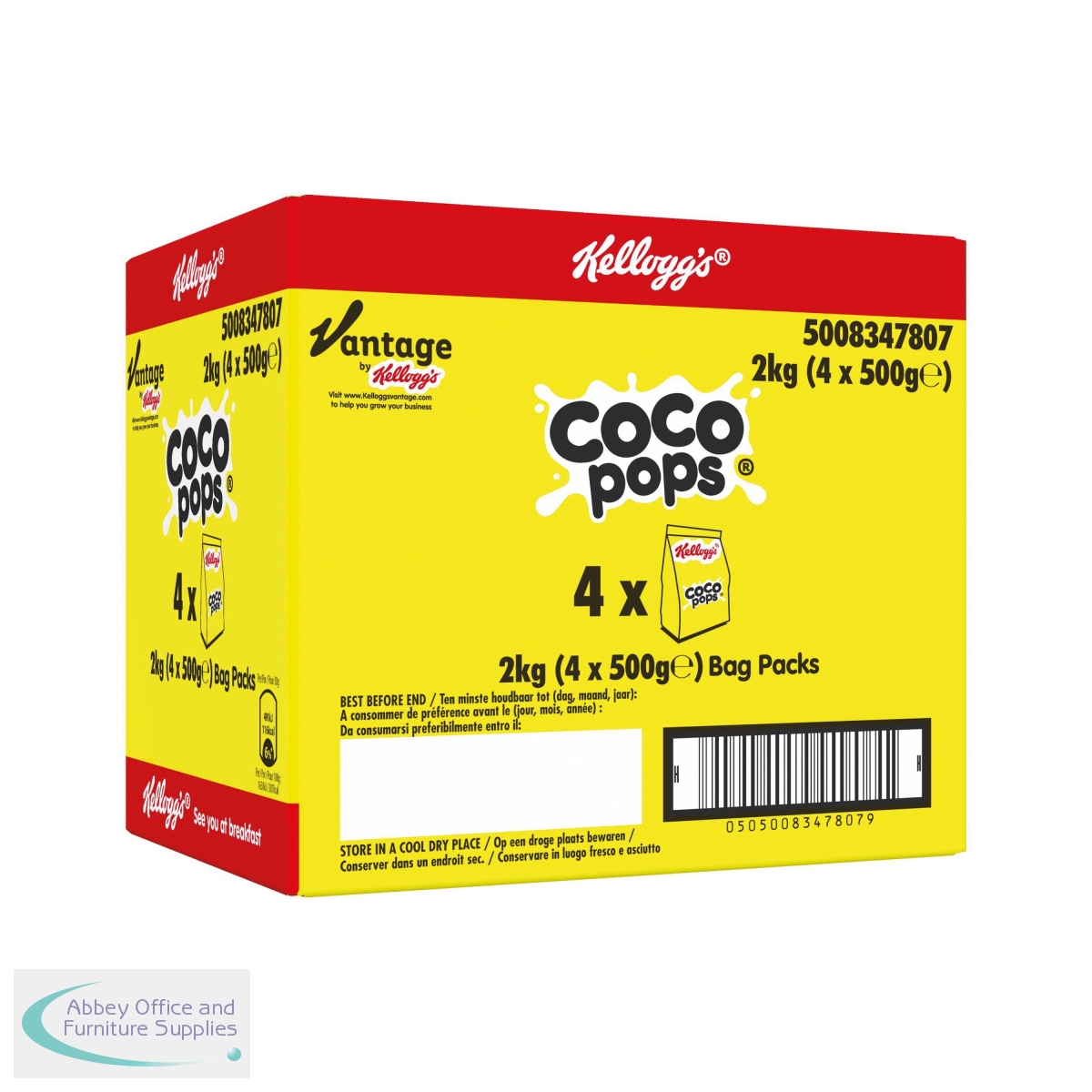 The irresistibly chocolatey taste of Kellogg's Coco Pops breakfast cereal, the chocolatey taste you know and love. Kellogg's Coco Pops meets 50% of your vitamin D need, which contributes to the maintenance of normal bones. Each bowl of Kellogg's Coco Pops is enriched with 8 essential vitamins and minerals including B vitamins, iron and folic acid, and best of all no artificial colours or sweeteners so you can rest assured you are getting only the best ingredients in your cereal. Each bag contains 500g. Designed for loose display for self-serve. Pack of 4.