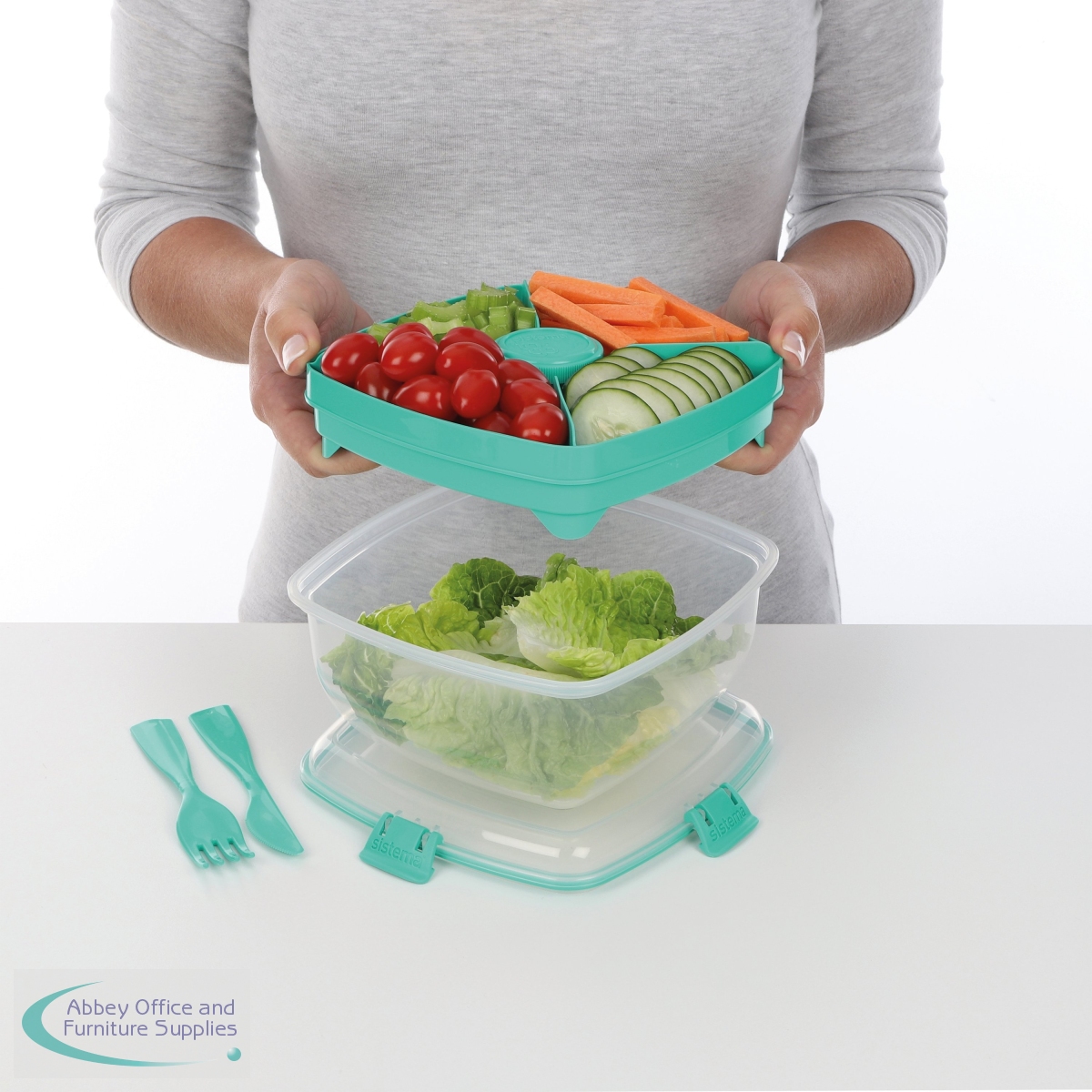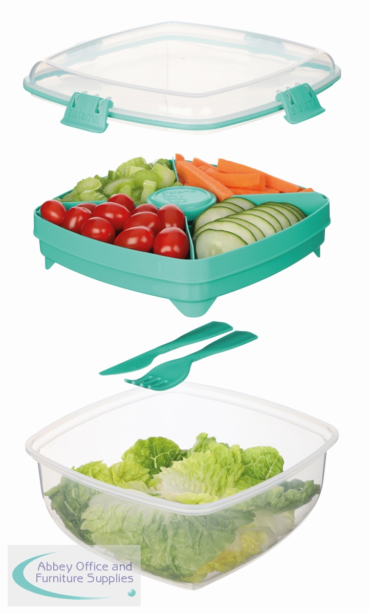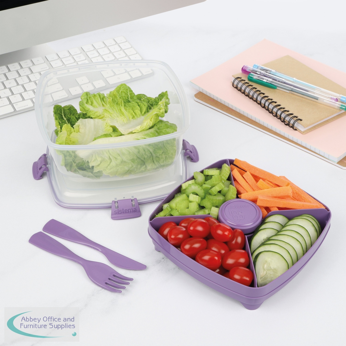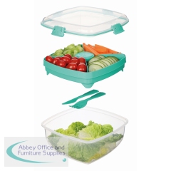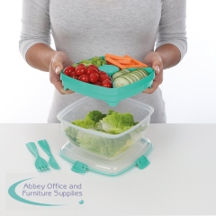 The Sistema Salad Max TO GO is a larger version of the Sistema Salad TO GO and is perfect for transporting larger salads on the go. The divided insert tray and dressing pot keep ingredients separate until ready to eat, while the generous sized base is perfect for mixing salads. The convenient knife and fork clip into the tray and eliminate the need to carry separate cutlery, plus the Sistema easy locking clips and flexible seal keep food fresher for longer.