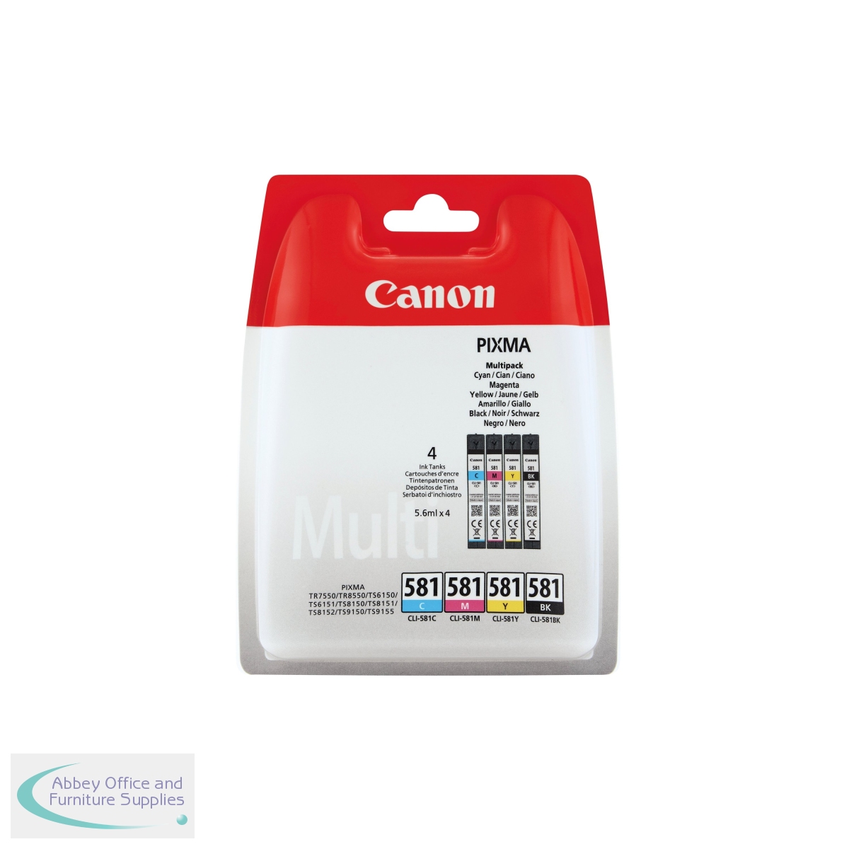 This Canon CLI-581 inkjet 4-cartridge multipack contains one cyan, magenta, yellow and black ink cartridge for printing documents and photos at very high quality. When used together with Canon paper, this set of four 5.6ml ink cartridges provides long lasting prints and fade resistant finishes thanks to the ChromaLife100 system with 200 pages in black and 250 pages in colour at ISO/IEC 24711 standard.