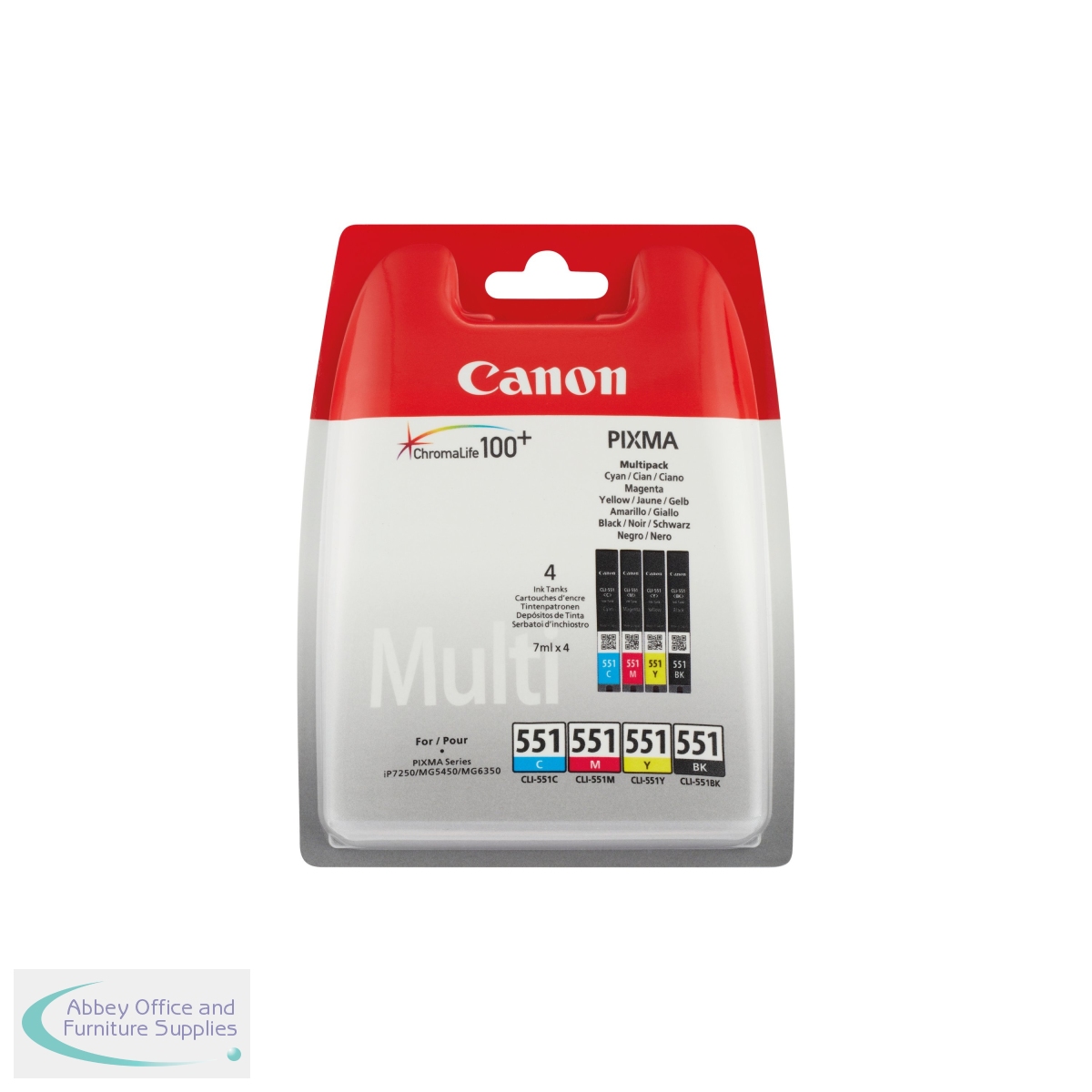 This Canon CLI-551 multi pack contains one each of cyan, magenta, yellow and black standard yield ink tanks. The set of four 7ml ink tanks offer you convenience and savings. The ChromaLife100+ system combined with Canon photo papers delivers stunning results and longevity. Genuine Canon Ink promises better quality and more reliability.