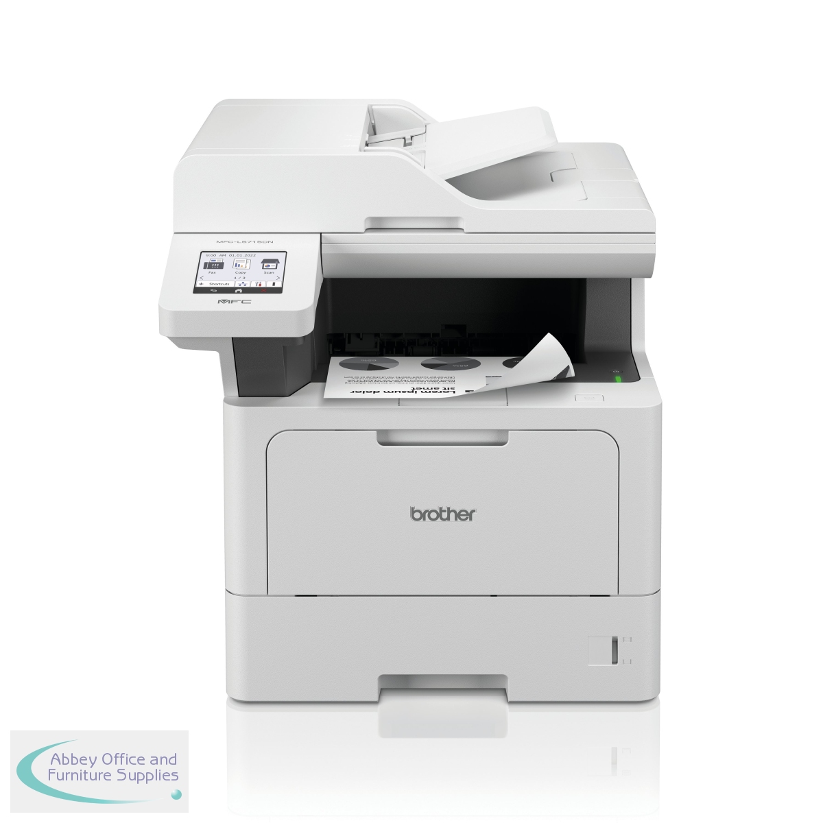 Brother MFC-L5715DN All-in-1 Mono Laser Printer comes with a flexible suite of security features and solutions that can be tailored to your business. Includes Near Field Communications (NCF)/card reader support. Connectivity: Hi-Speed USB 2.0, USB 2.0 host (rear), Wired network Gigabit ethernet and mobile devices. Print resolution of up to 1200 x 1200 dpi. 48 ppm 1-sided/24 spm 2-sided (mono). Copy functions include Multi-copying/stack/sort, enlargement/reduction ratio, 2 in 1 ID copying, N in 1 copying, allowing 2 or 4 pages on a single A4 sheet, Receipt copying for clearer copies. CIS scanner for colour and mono scanning with a scan resolution from ADF of 600 x 600 dpi, with scan resolution from scanner glass (A4) of 1200 x 1200 dpi. Scan speed 1-sided: 28 ipm mono/20 ipm colour. Fax with fax modem 33,600 bps (Super G3). Greyscale: 256 shades of grey, broadcasting the same fax message up to 350 locations, memory transmission of up to 500 pages. A 250 sheet standard paper input tray, with a 30 sheet multi-purpose tray and 50 sheet automatic document feeder (ADF). With an 8.9cm colour touchscreen LCD control panel. Supplied with in-box high yield black toner. With a recommended monthly duty cycle of up to 5,000 pages. Dimensions: 417 x 461 x 448mm. 17.0kg.