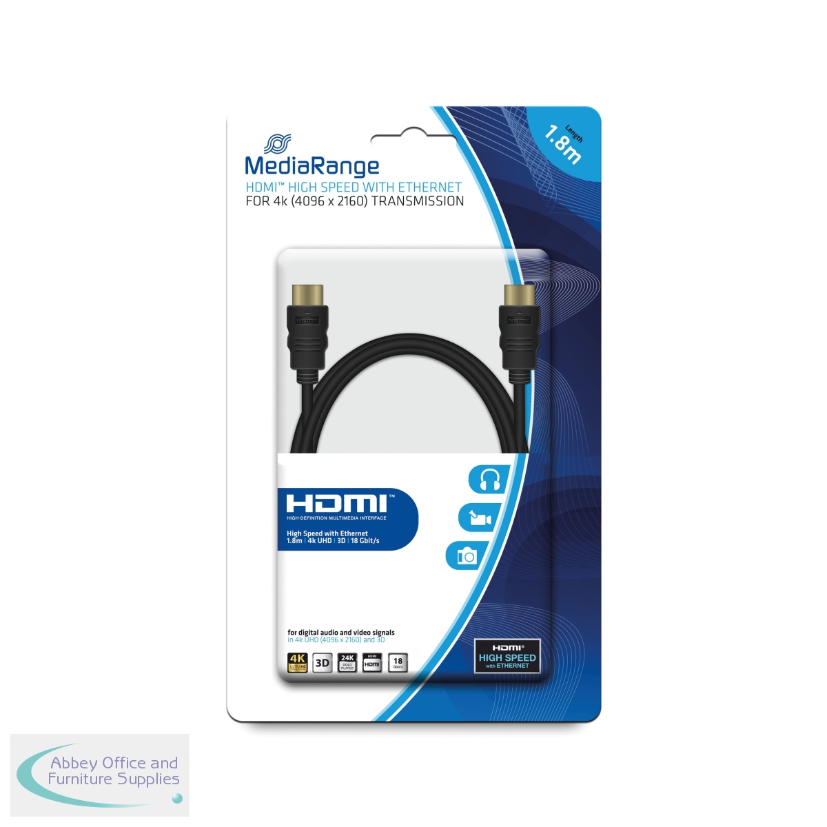 Whether at home or in the office, MediaRange has just the right cable. This diverse range of dependable high quality cables and extension cords guarantees optimal and trouble-free data transmission. 1.8m HDMI cable for high-definition multimedia interface. For digital audio and video signals in 4k UHD (4096 x 2160) and 3D. High speed with ethernet. 24k gold plated connectors.