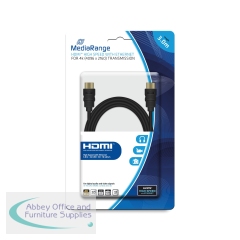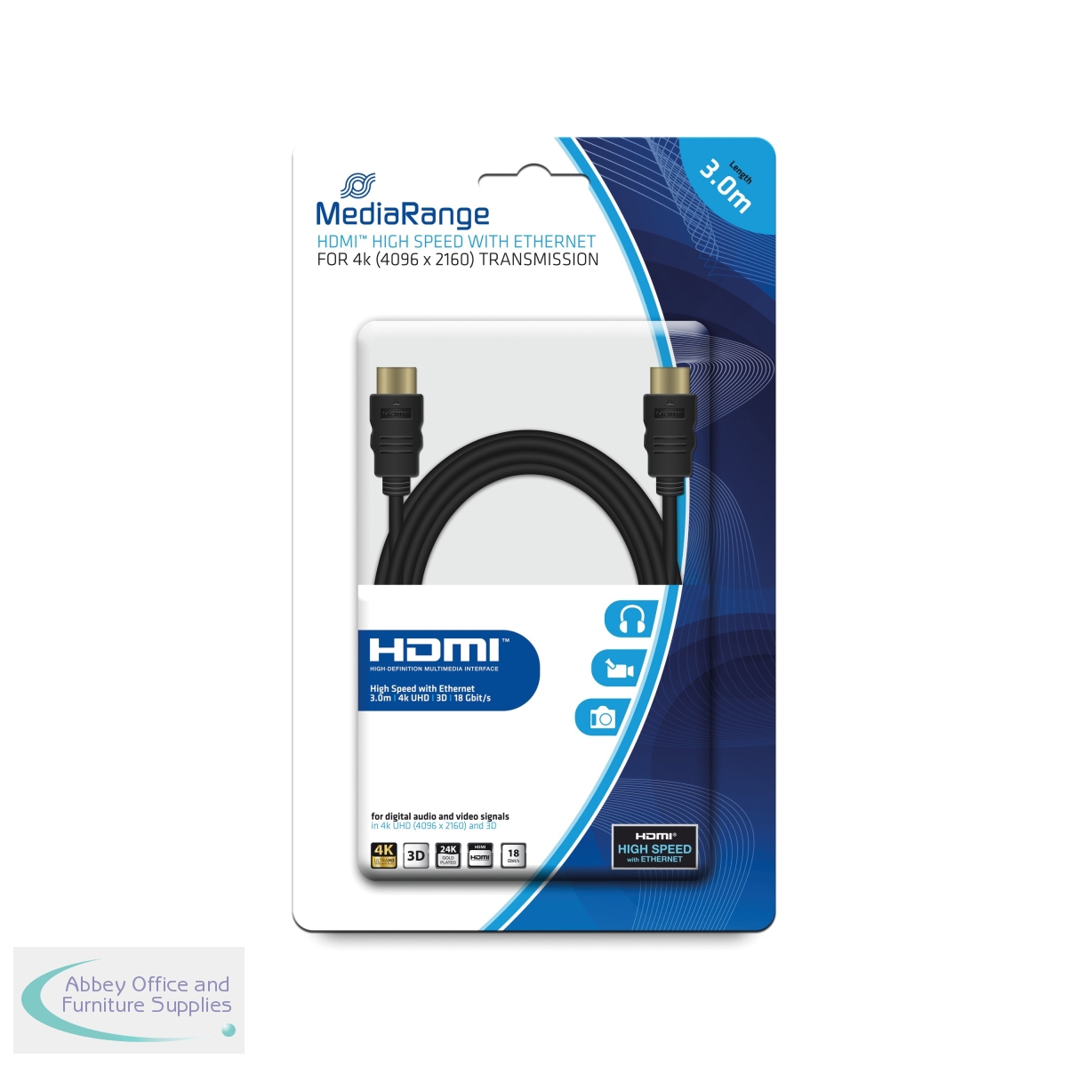 Whether at home or in the office, MediaRange has just the right cable. This diverse range of dependable high quality cables and extension cords guarantees optimal and trouble-free data transmission. 3m HDMI cable for high-definition multimedia interface. For digital audio and video signals in 4k UHD (4096 x 2160) and 3D. High speed with ethernet. 24k gold plated connectors.