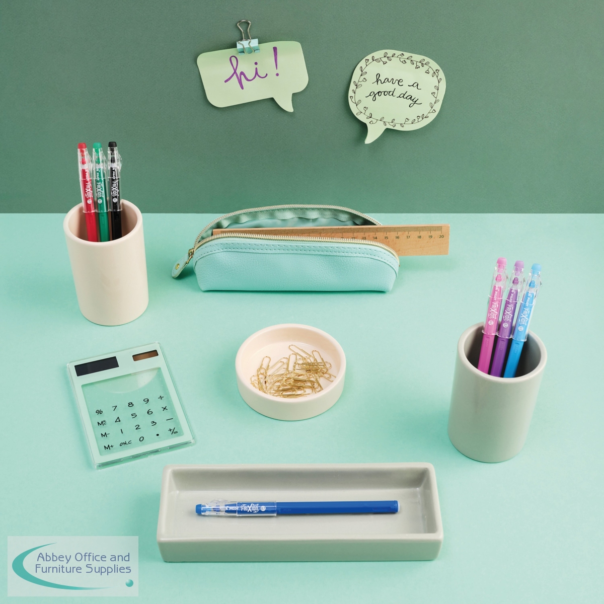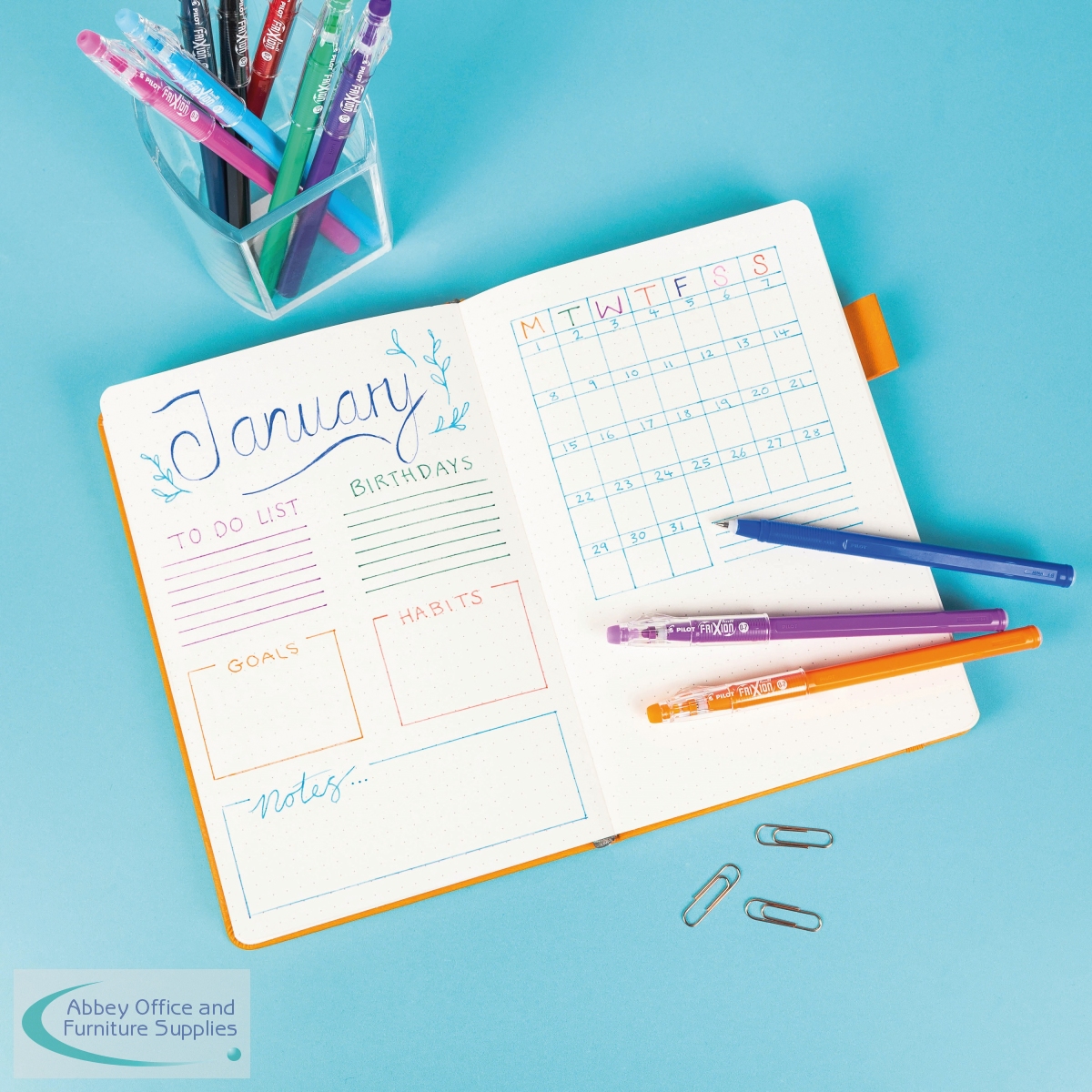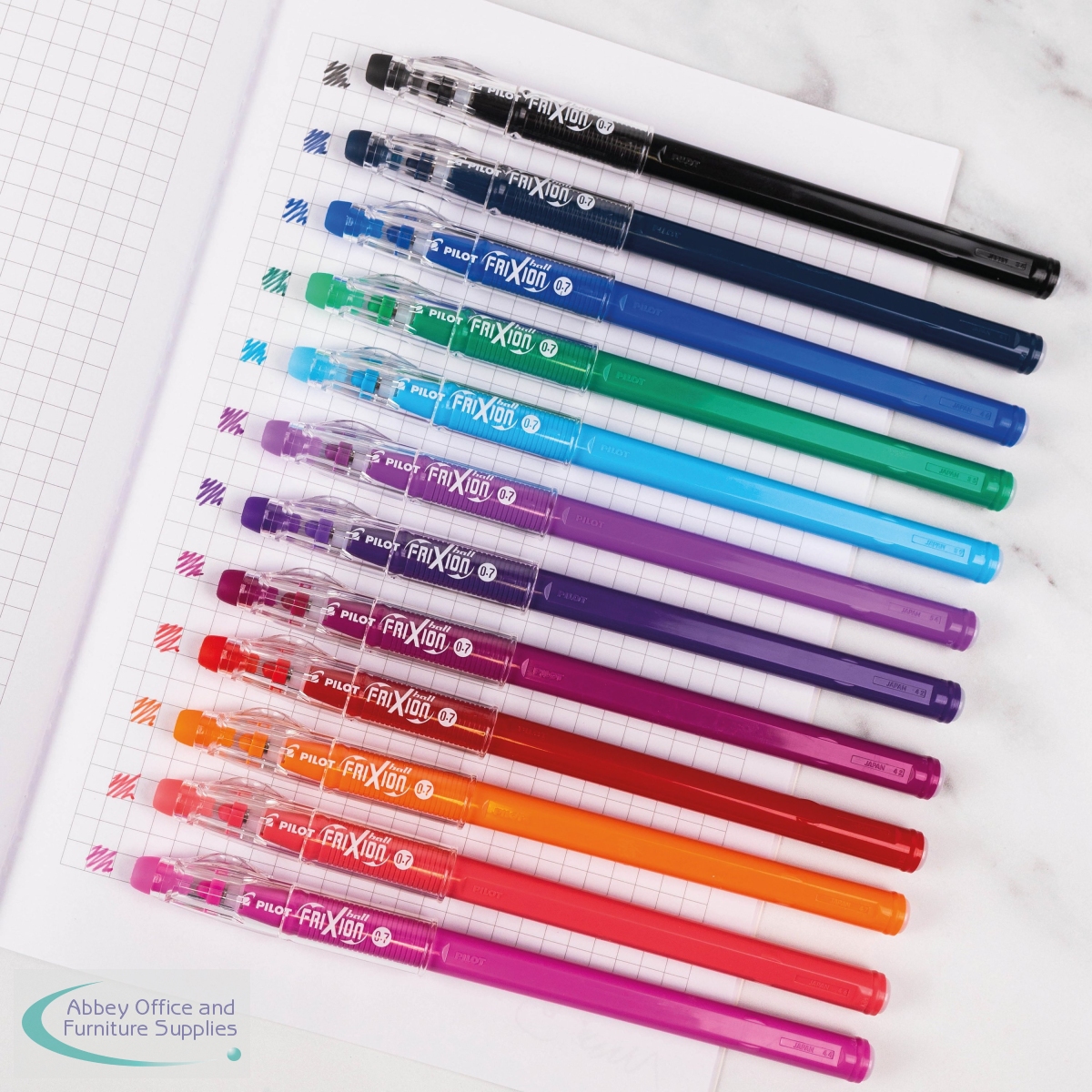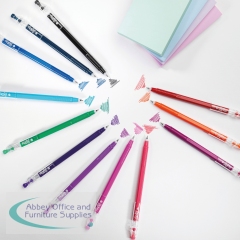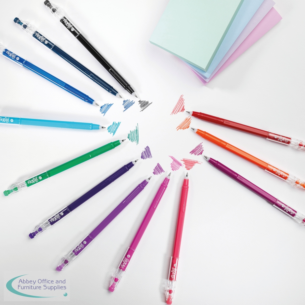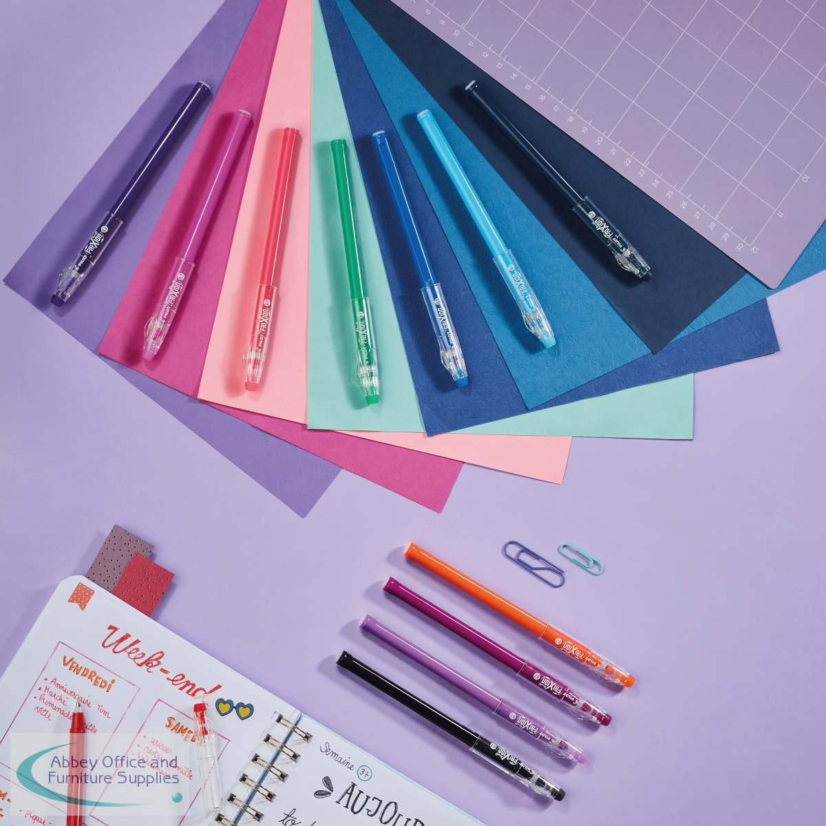 FriXion Ball Stick, the new erasable gel pen with a compact and minimal design in 12 bright and vibrant colours. The Frixion Ball Stick, like all pens that use the special Frixion ink, allows you to write, erase and rewrite effortlessly without the need to cross anything out. Perfect for note taking, homework and more, the Frixion Ball Stick offers medium sized writing, featuring a 0.7 mm diameter tip which is resistant to drops and shocks. Supplied in a wallet of 12 pens in the assorted colours of black, blue, red, green, violet, pink, light blue, light green, orange, purple, coral pink and sky blue.