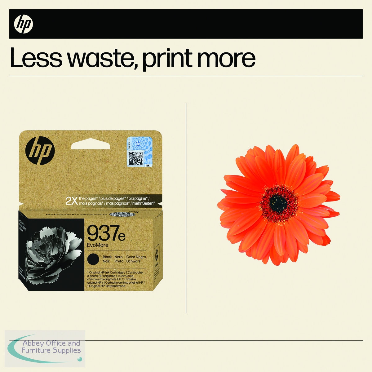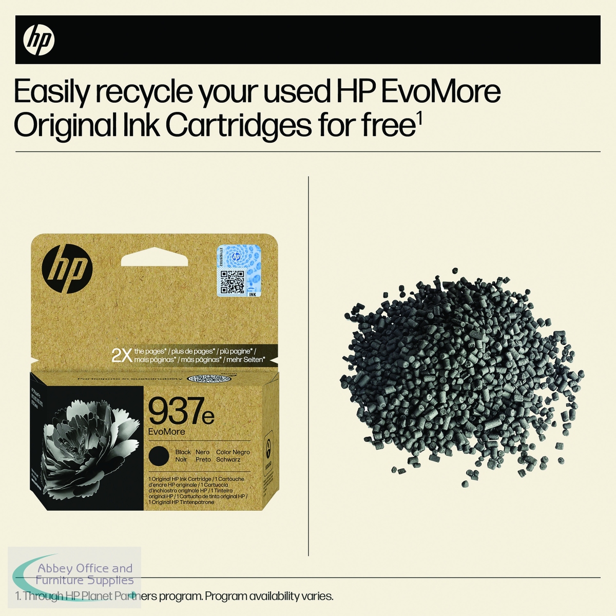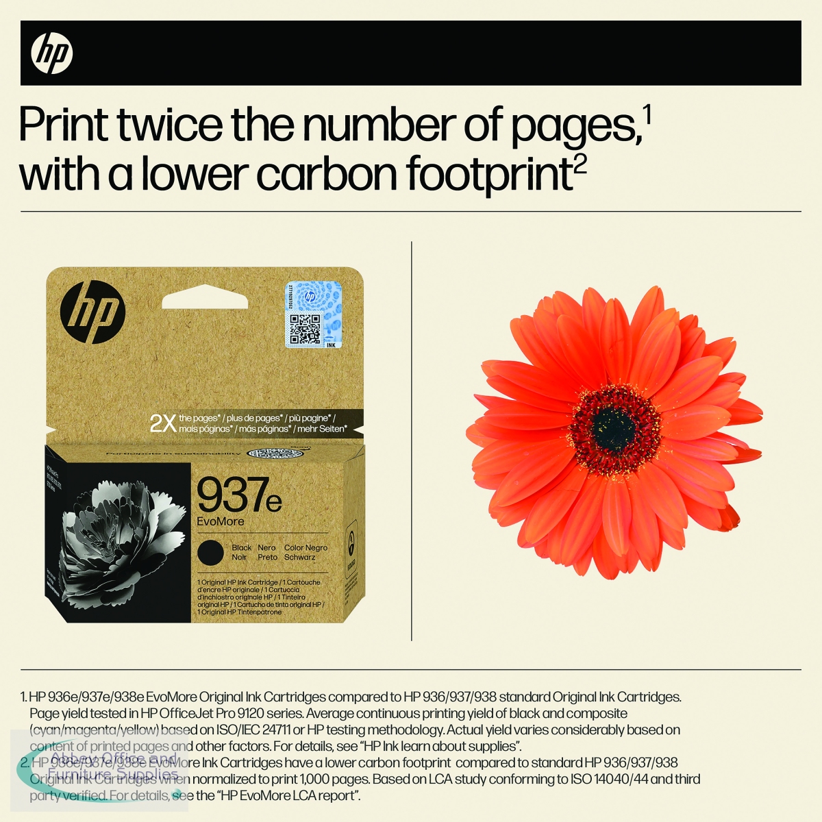 The HP 937E EvoMore ink cartridge is ideal for high-volume and sustainability-conscious business printing. Designed to print two times the pages as standard cartridges with half the carbon footprint and be easily recycled, HP EvoMore Original Ink Cartridges combine HPs legendary performance and quality with added sustainability features.
