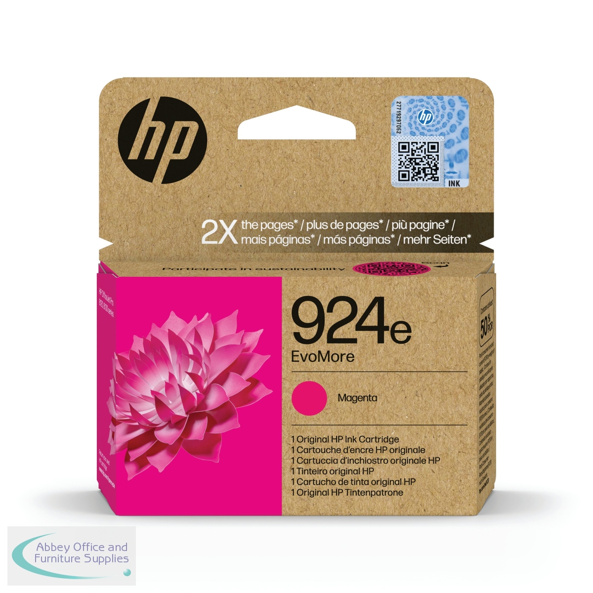 The HP 924E EvoMore ink cartridge is ideal for high-volume and sustainability-conscious business printing. Designed to print two times the pages as standard cartridges, have a lower carbon footprint and be easily recycled, HP EvoMore Original Ink Cartridges combine HPs legendary performance and quality with added sustainability features.