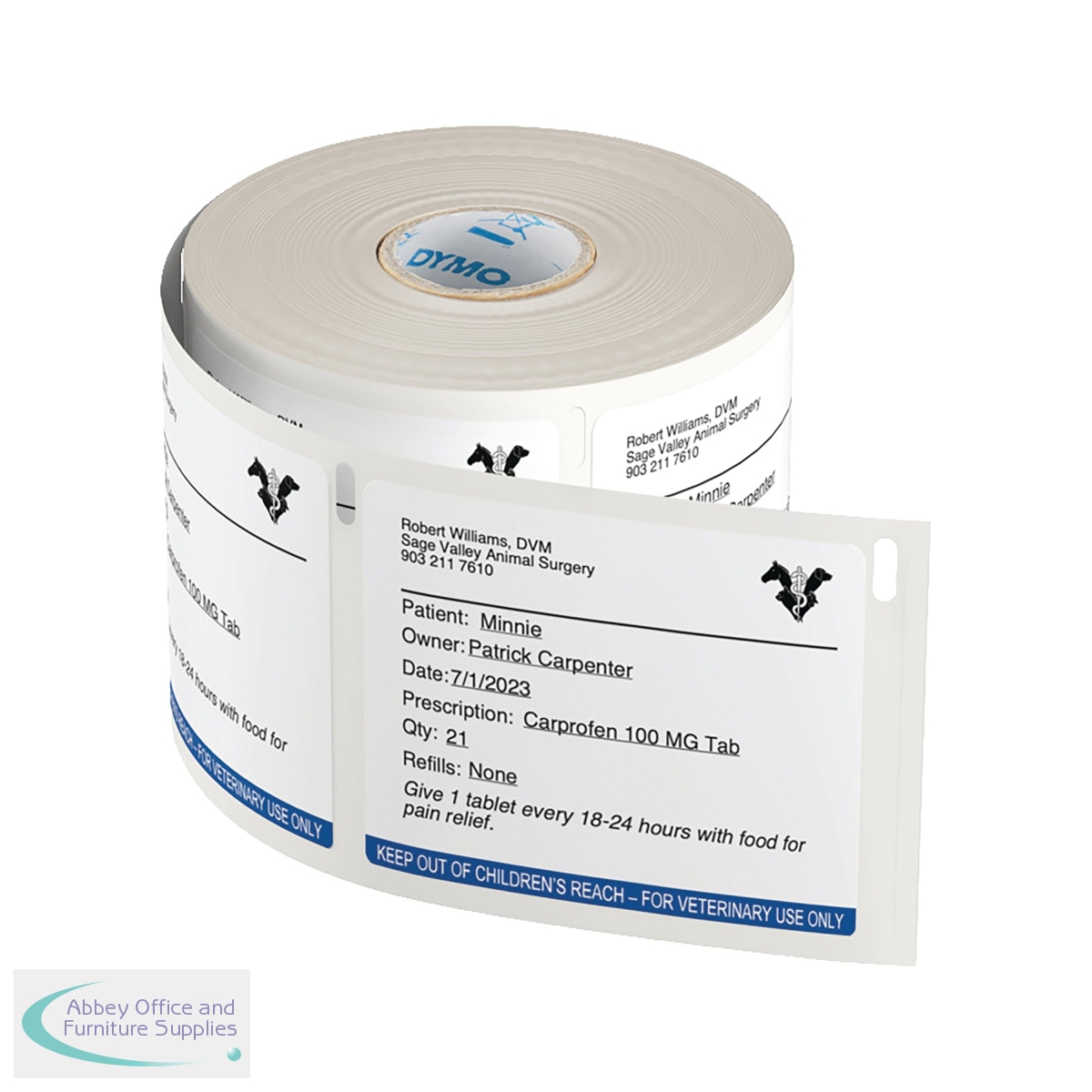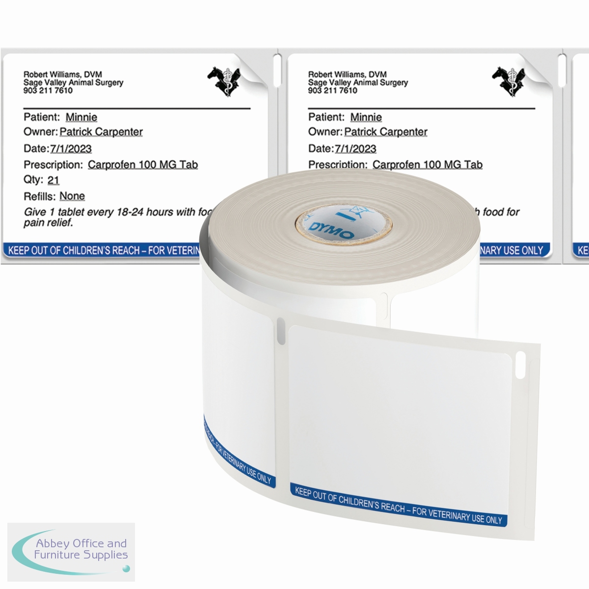 These Dymo Labelwriter Veterinary labels are suitable for use with the LabelWriter 5 Series: 5XL, 550T and 550 and are supplied in one roll of 400 labels. Each measuring 70mm x 54mm, the labels are ideal for clearly labelling prescriptions for accurate medication administration and incorporating logos, text, QR codes etc., via DYMO Connect for Desktop software. The labels adhere to strict industry and regulatory standards and help to improve Veterinary Practice efficiency.