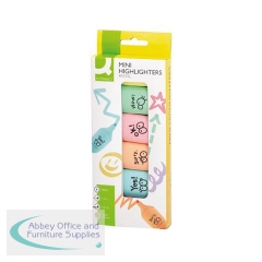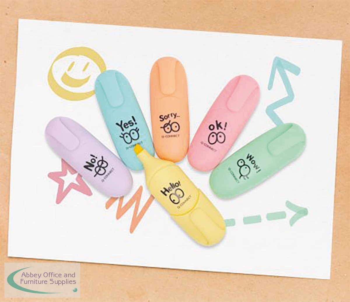 The Q-Connect joyful mini highlighter set contains handy, compact highlighters with cute, expressive eyes printed on the barrel. The chisel tip draws both broad lines for highlighting or narrow lines for underlining. Suitable for most papers and will not fade on fax paper, these six assorted pastel highlighters come in yellow, green, pink, orange, blue and purple.