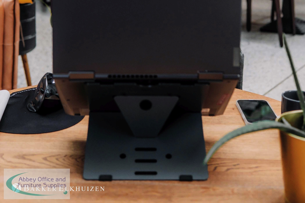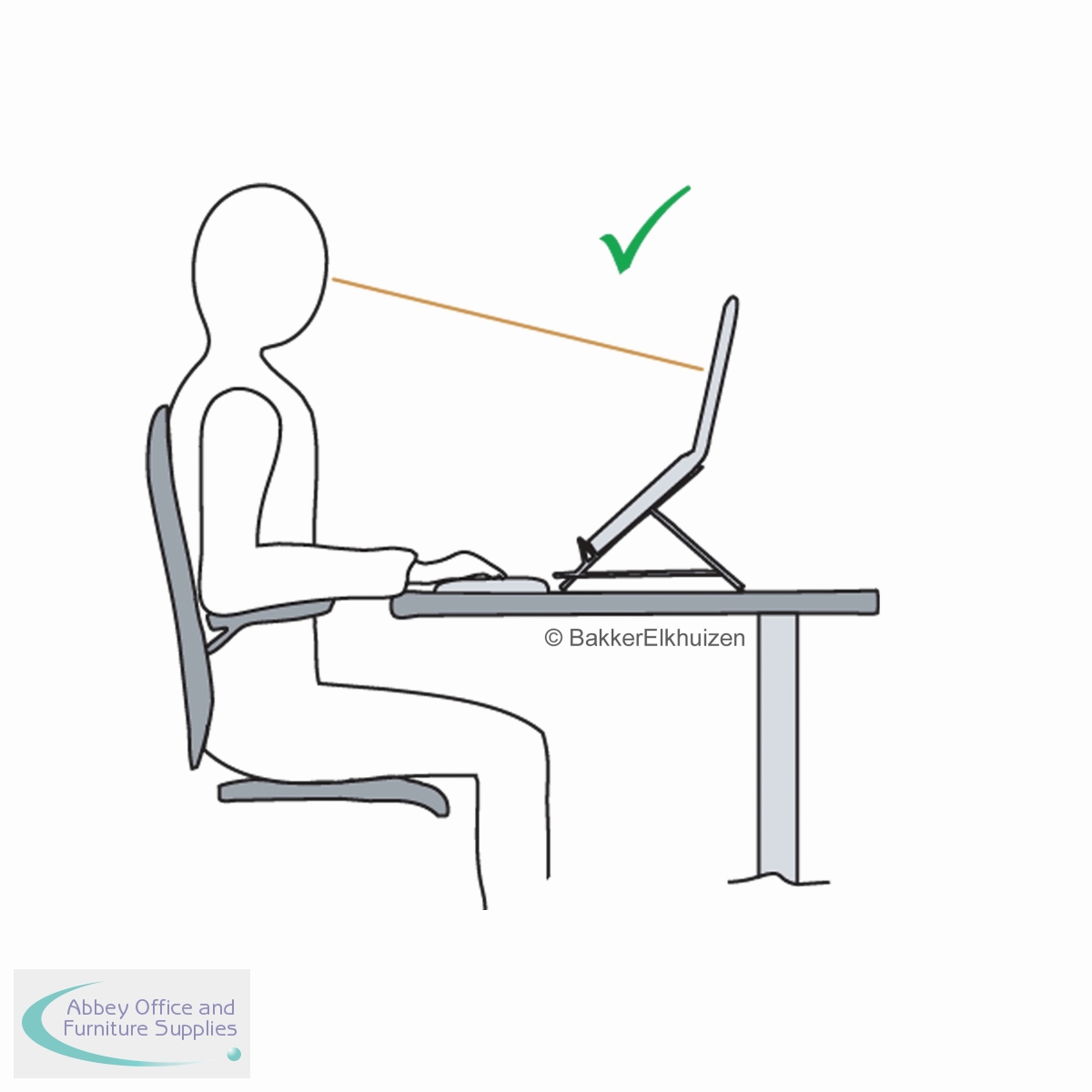 The BakkerElkhuizen Ergo-Q 160 laptop stand is suitable for laptops up to 17 inches as well as tablets and mobile screens. It is has five height adjustable levels for viewing comfort. The stand allows you to adjust your laptop screen to the correct height, angle and distance so that you automatically adopt an ergonomically correct posture. The stand is compact, foldable and you can easily take this laptop stand with you anywhere, as it fits into any backpack or laptop bag.