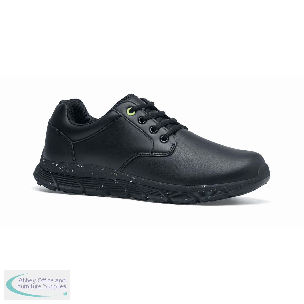 Shoes For Crews Saloon II Eco Mens Leather OB Shoe with Superior slip and clog resistant outsole plus TripGuard. Water resistant with a padded collar and tongue as well as being metal free. The shoe has a removable cushioned insole (Recycled EVA) and recycled Polyester lining. Made From Mostly Recycled Materials.
