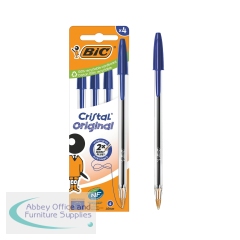 These Bic Cristal Ballpoint Pens feature a durable tungsten carbide ball mechanism and smooth, instant drying ink for reliable, everyday use. The medium 1.0mm tip produces a thin 0.32mm line. The hexagonal barrel includes a blue cap and end plug that matches the ink colour for easy identification. This pack contains 4 blue pens in a recyclable cardboard box.