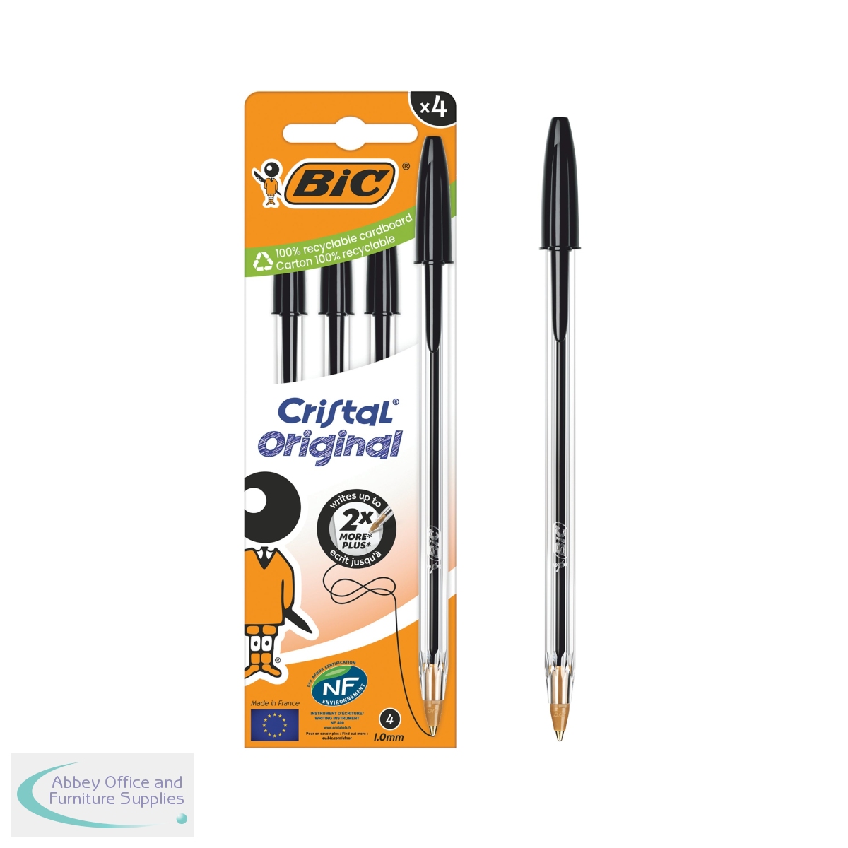 These Bic Cristal Ballpoint Pens feature a durable tungsten carbide ball mechanism and smooth, instant drying ink for reliable, everyday use. The medium 1.0mm tip produces a thin 0.32mm line. The hexagonal barrel includes a black cap and end plug that matches the ink colour for easy identification. This pack contains 4 black pens in a recyclable cardboard box.