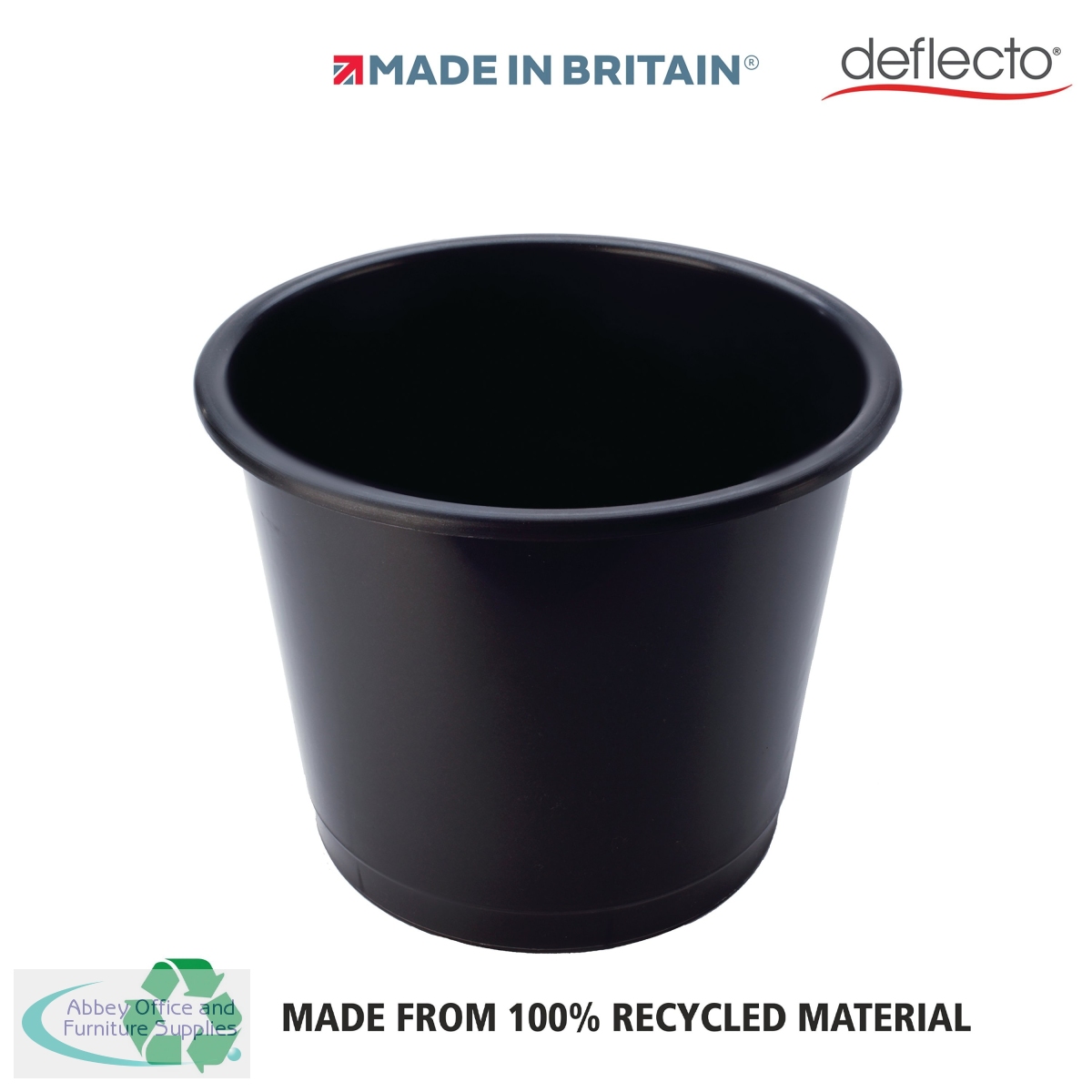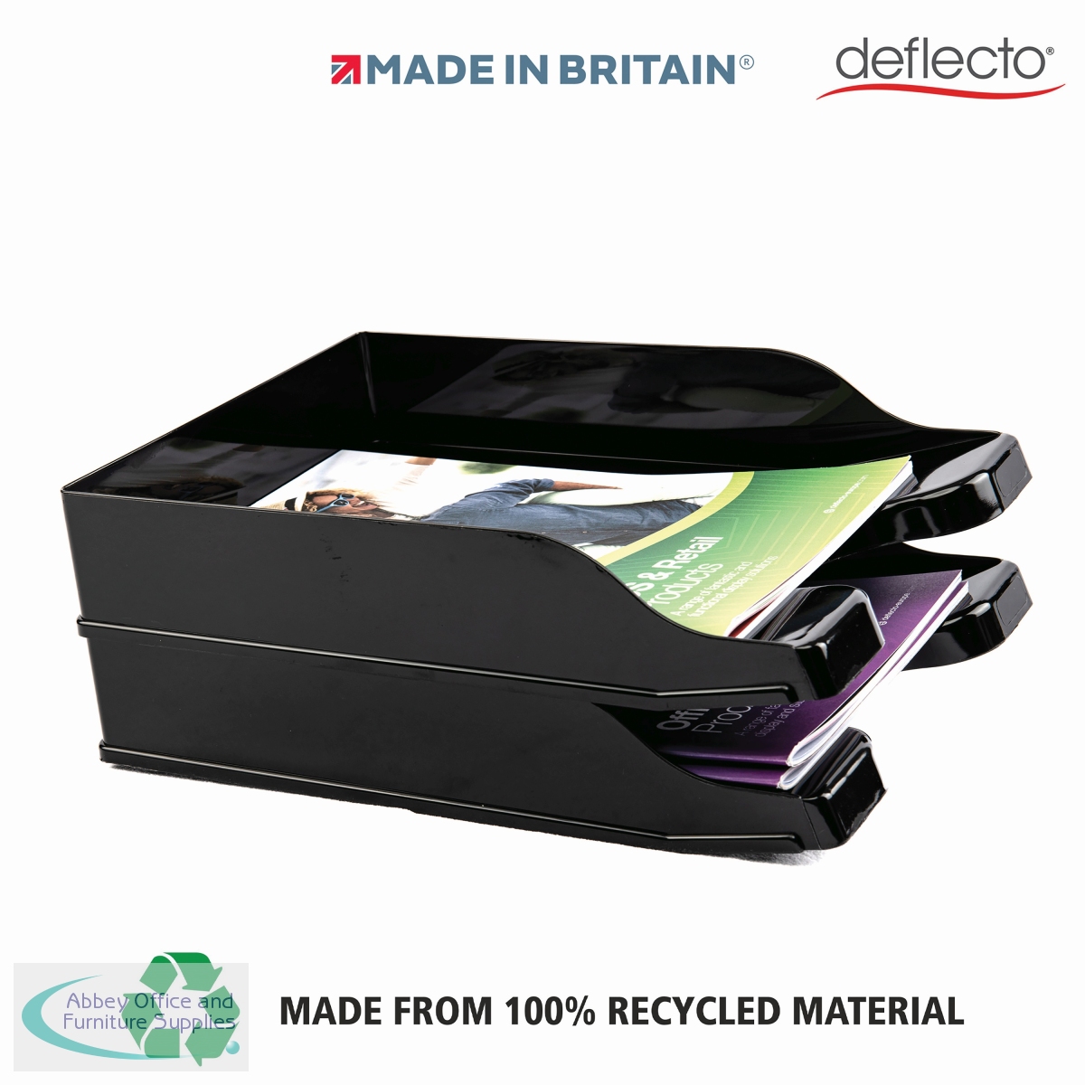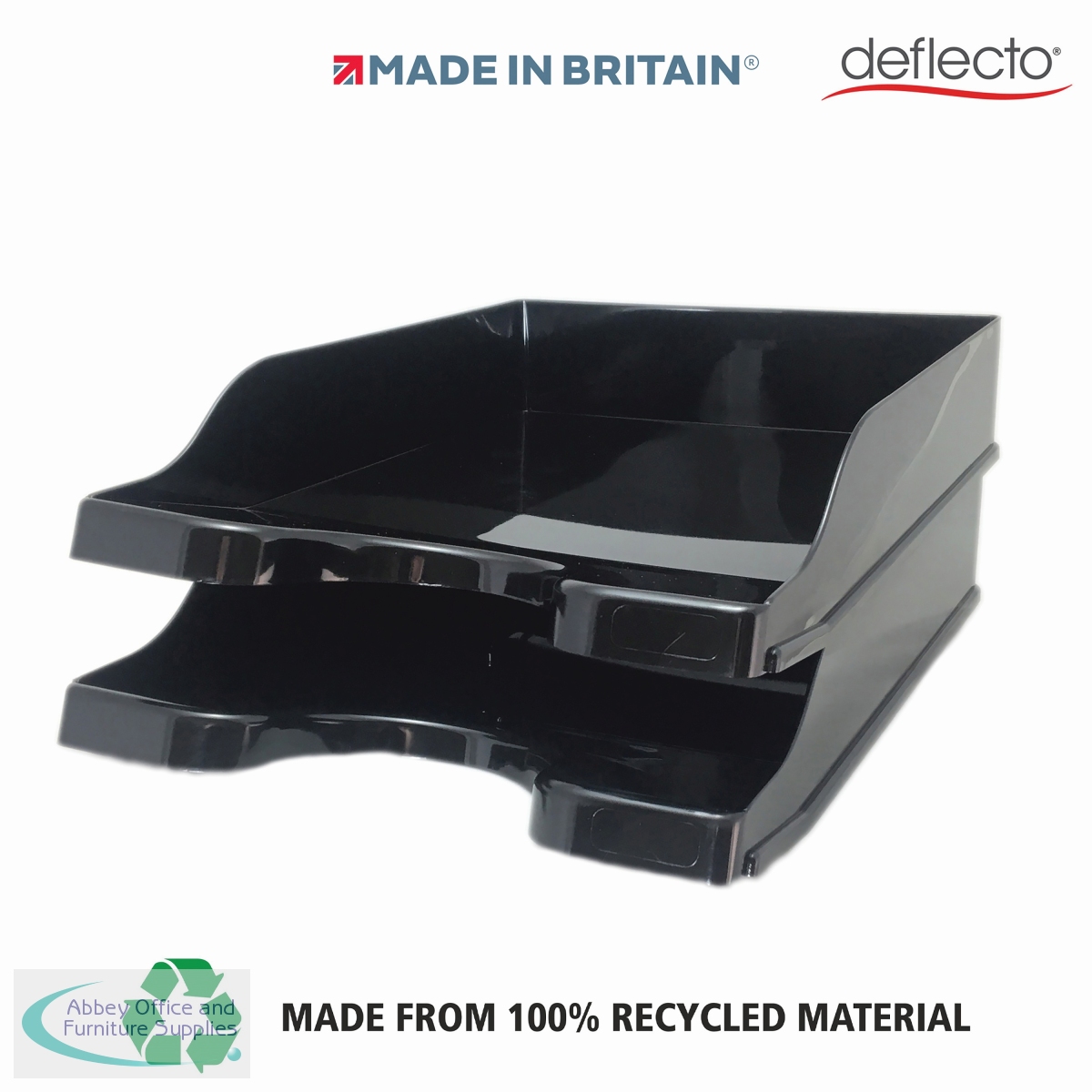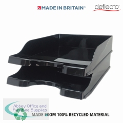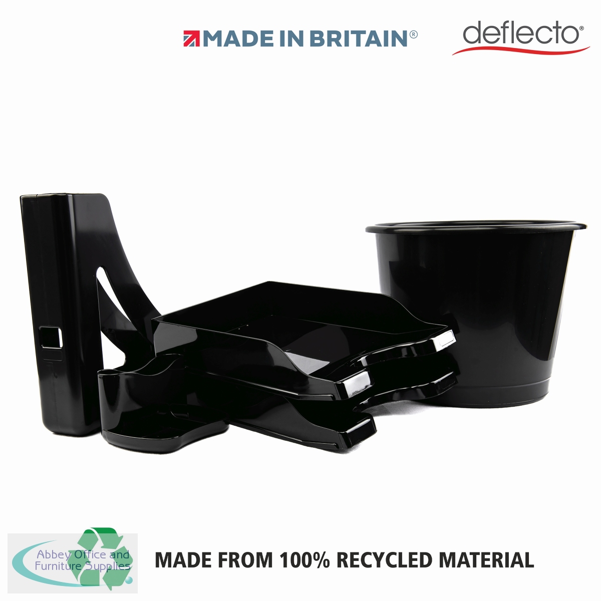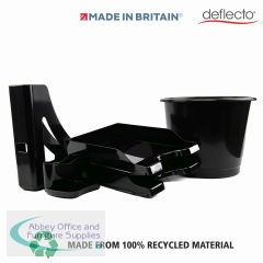 The Deflecto recycled starter kit includes one pen pot organiser, one magazine file, 2 stacking letter trays and a matching 14 litre waste bin. The Deflecto Stylish desk accessories are lightweight and durable in a striking black colour which creates a modern and attractive working space. Manufactured from 100% recycled material and designed with sustainability in mind, these products are also 100% recyclable. The Magazine file and Letter Trays are compatible with paper sizes up to A4. The letter trays, desk organiser and magazine file create space and order to the workstation and the matching 14 litre waste bin finishes off the collection. Proudly made in Britain, Deflecto is well known for their premium quality and craftsmanship.