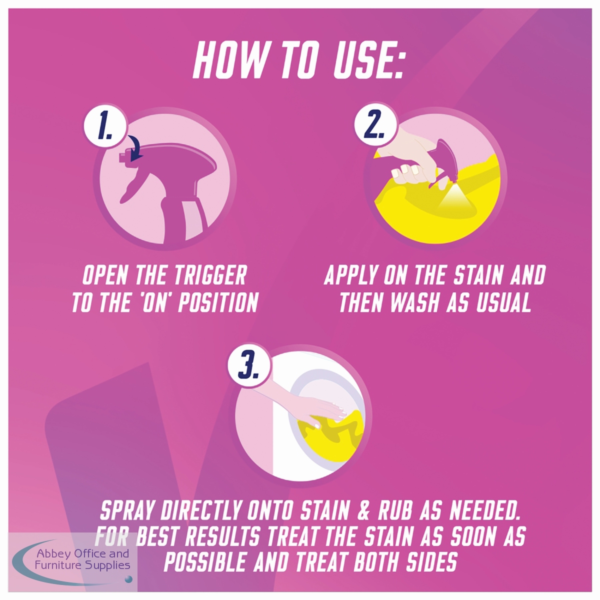 Tackle a host of stains easily with the help of Vanish Oxi Action Fabric Stain Remover Spray. This convenient spray makes it easy to pre-treat tough marks before they go into the wash. This simple but effective formula lifts stains away - even those deep within the clothing fibres. Use on coloured and white clothing.
