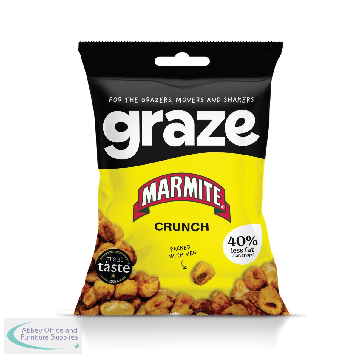 Graze Marmite Crunch 35g pack with yeast extract seasoned broad beans and corn hoops. An intensely flavoured, light and crunchy crisp alternative packed with vegetables. Supplied in a pack of 10.