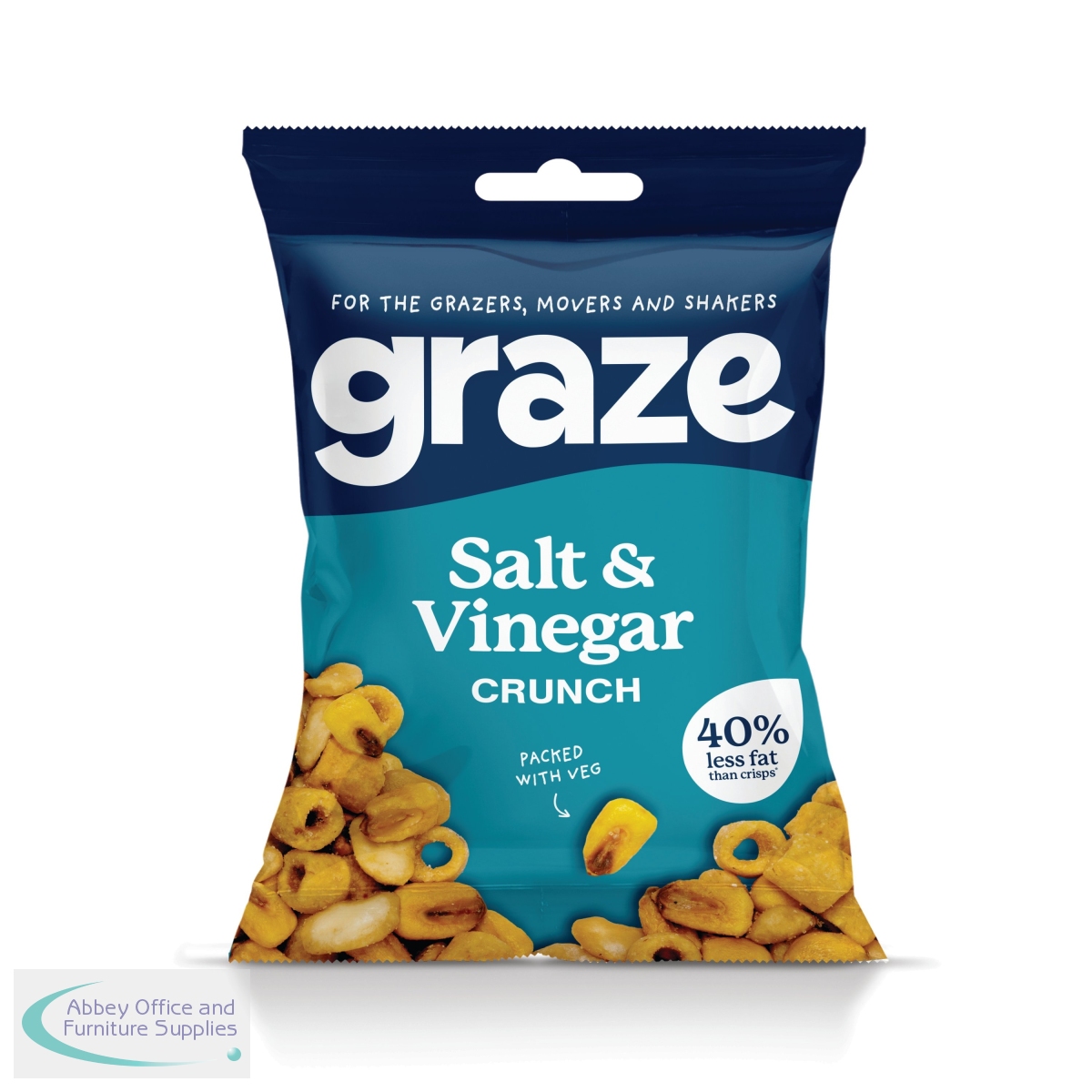 Graze Salt and Vinegar Crunch 35g pack with salt and pepper seasoned broad beans, corn and corn hoops. An intensely flavoured, light and crunchy crisp alternative packed with vegetables. Supplied in a pack of 10.