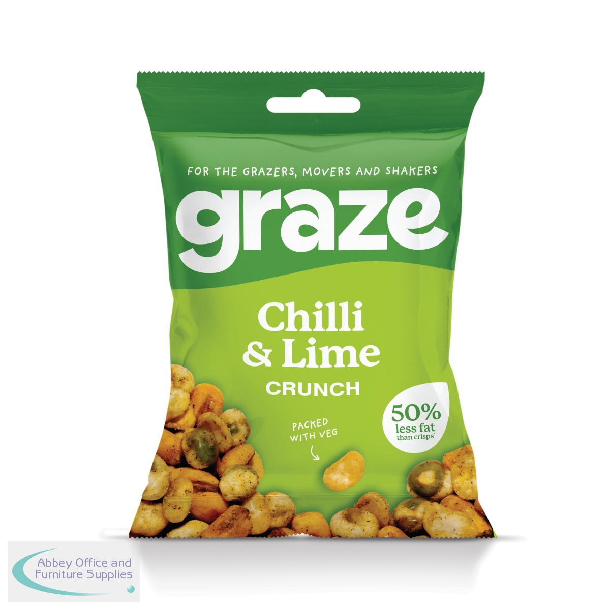 Graze Chilli and Lime Crunch 35g pack with chilli and lime seasoned broad beans, corn and coated peas. An intensely flavoured, light and crunchy crisp alternative packed with vegetables. Supplied in a pack of 10.
