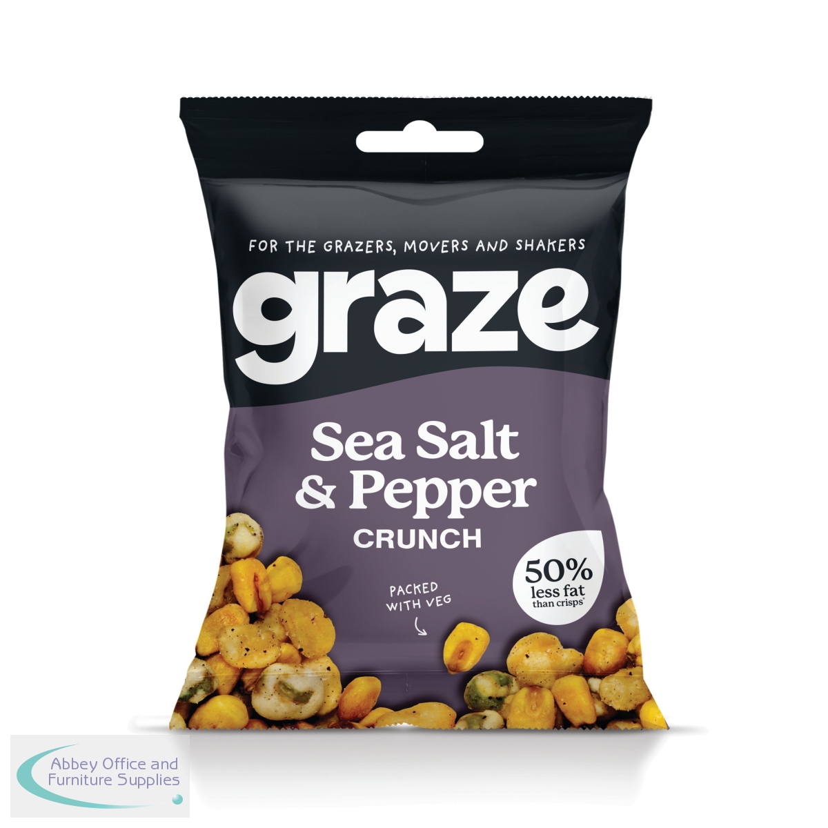 Graze Salt and Pepper Crunch 35g pack with salt and pepper seasoned broad beans, corn and coated peas. An intensely flavoured, light and crunchy crisp alternative packed with vegetables. Supplied in a pack of 10.