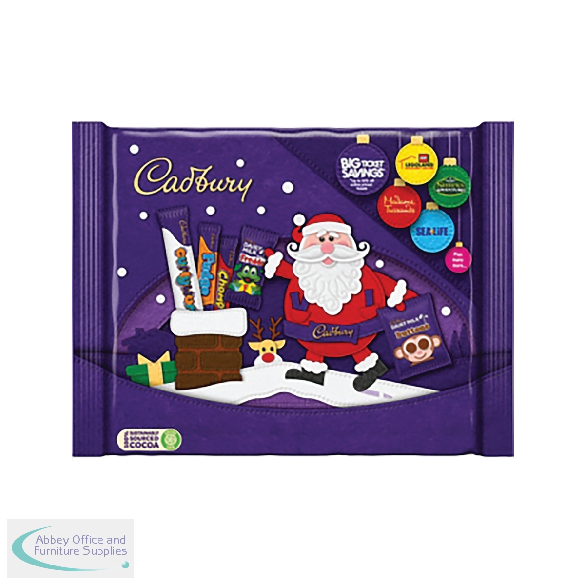 This Christmas selection pack includes: Cadbury Fudge, Cadbury Dairy Milk Buttons Treat size, Treat size Cadbury Curly Wurly, Cadbury Chomp and Cadbury Dairy Milk Freddo.