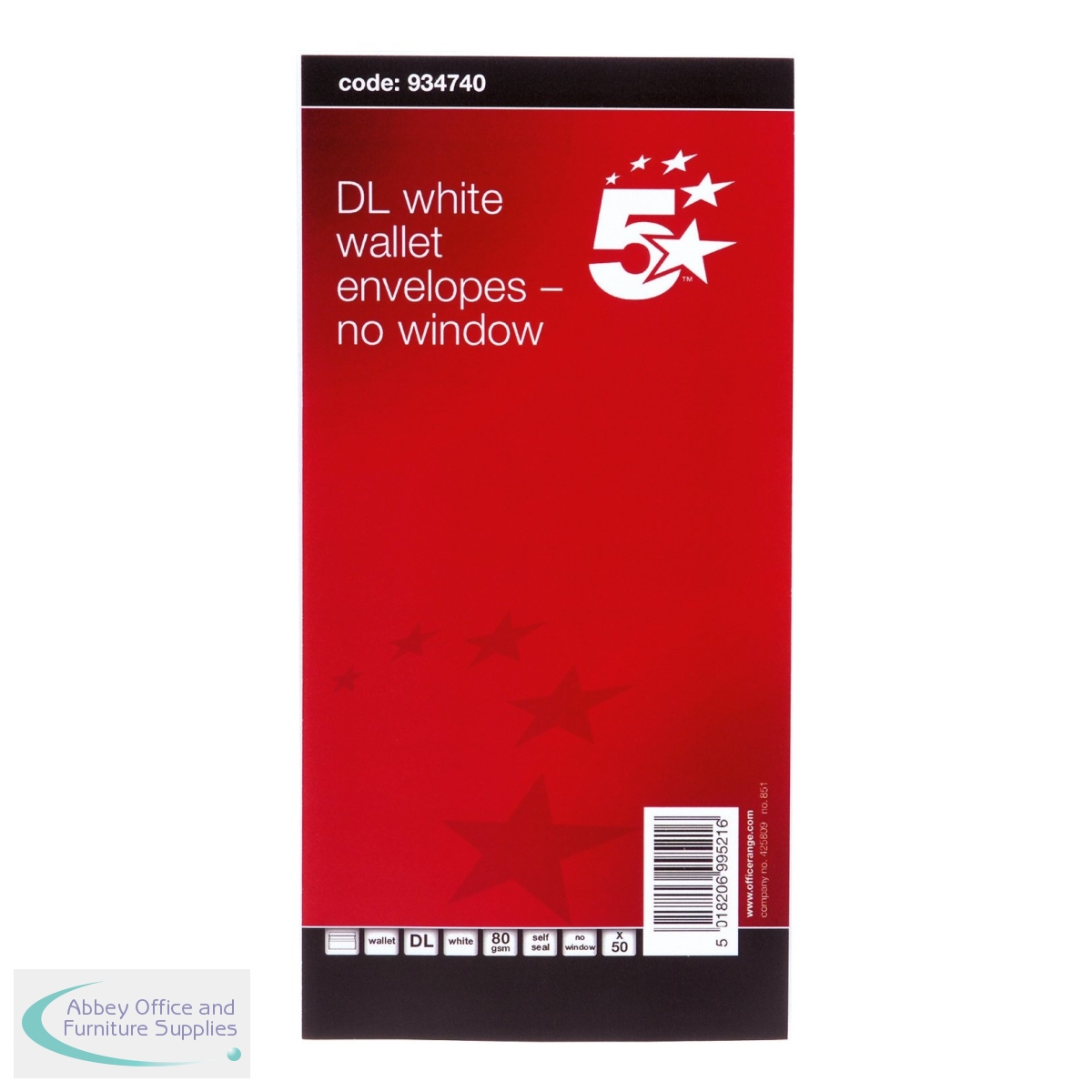 FS934740 - 5 Star Office Envelopes Wallet Self Seal 80gsm DL 220x110mm White Retail Pack (Pack of 50)