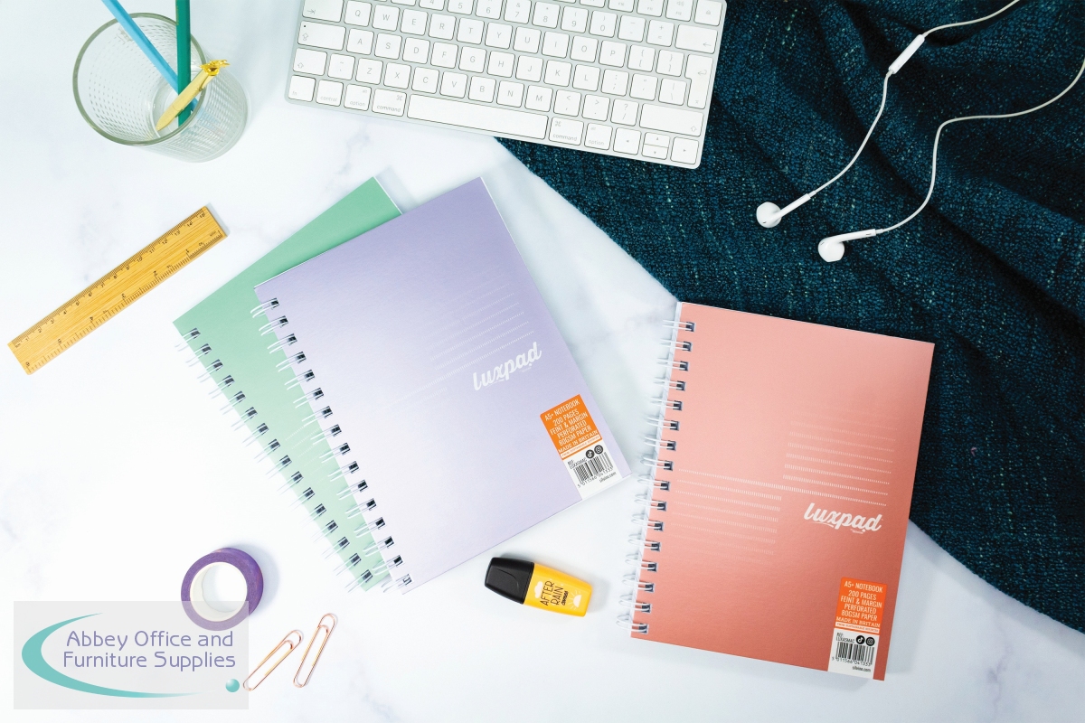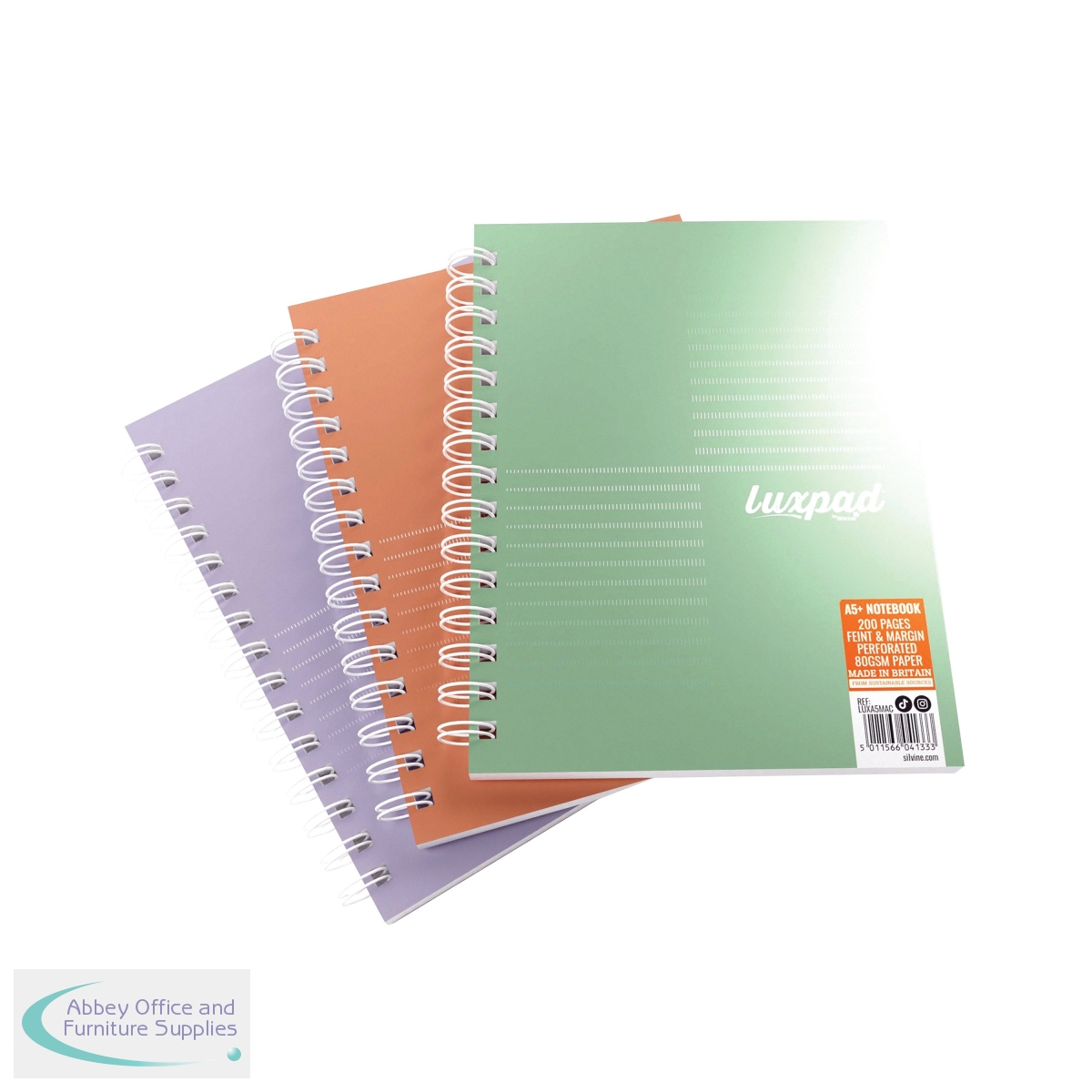 These A5+ wirebound notebooks by Silvine are part of the Luxpad range. They feature 200 pages of high quality 80gsm white paper, ruled 8mm feint with margin. The pages are micro-perforated and punched for filing while the wire binding allows the notebooks to lay flat and makes page turning a breeze. The three Metallic covers in this assorted pack are gloss sealed making them more durable and offering additional wipeability. The pack features 3 Assorted metallic colours: Terracotta, Lavender and Sage.
