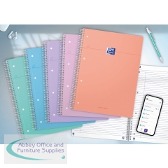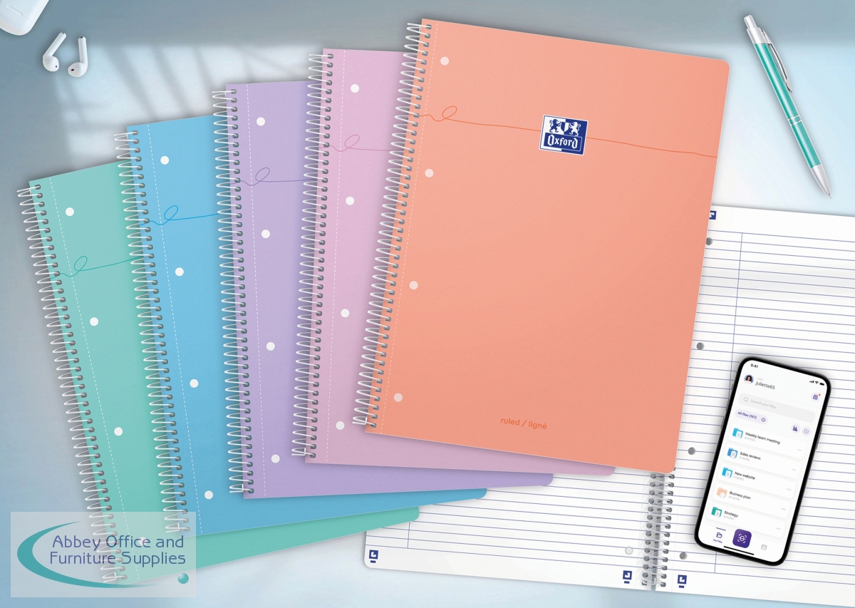 The Oxford Smart A4+ wire bound notebook is perfect for all note-taking needs. Featuring a scratch-resistant, matte laminated, soft card cover to protect notes and a rigid backboard which is perfect for writing standing up, even without a desk or a table. Containing 160 pages of smooth white Optik Paper which can be written on both sides of the page. It is also Scribzee enabled so by using the Oxford Scribzee app, you can scan, save and share your notes. The detachable micro-perforated sheets are perfect for removing pages quickly and easily. The pages are printed with 7mm ruled lines with 4 holes for easy insertion into a binder and once detached, the sheets are A4 format. Supplied in a pack of 5 in assorted pastels.