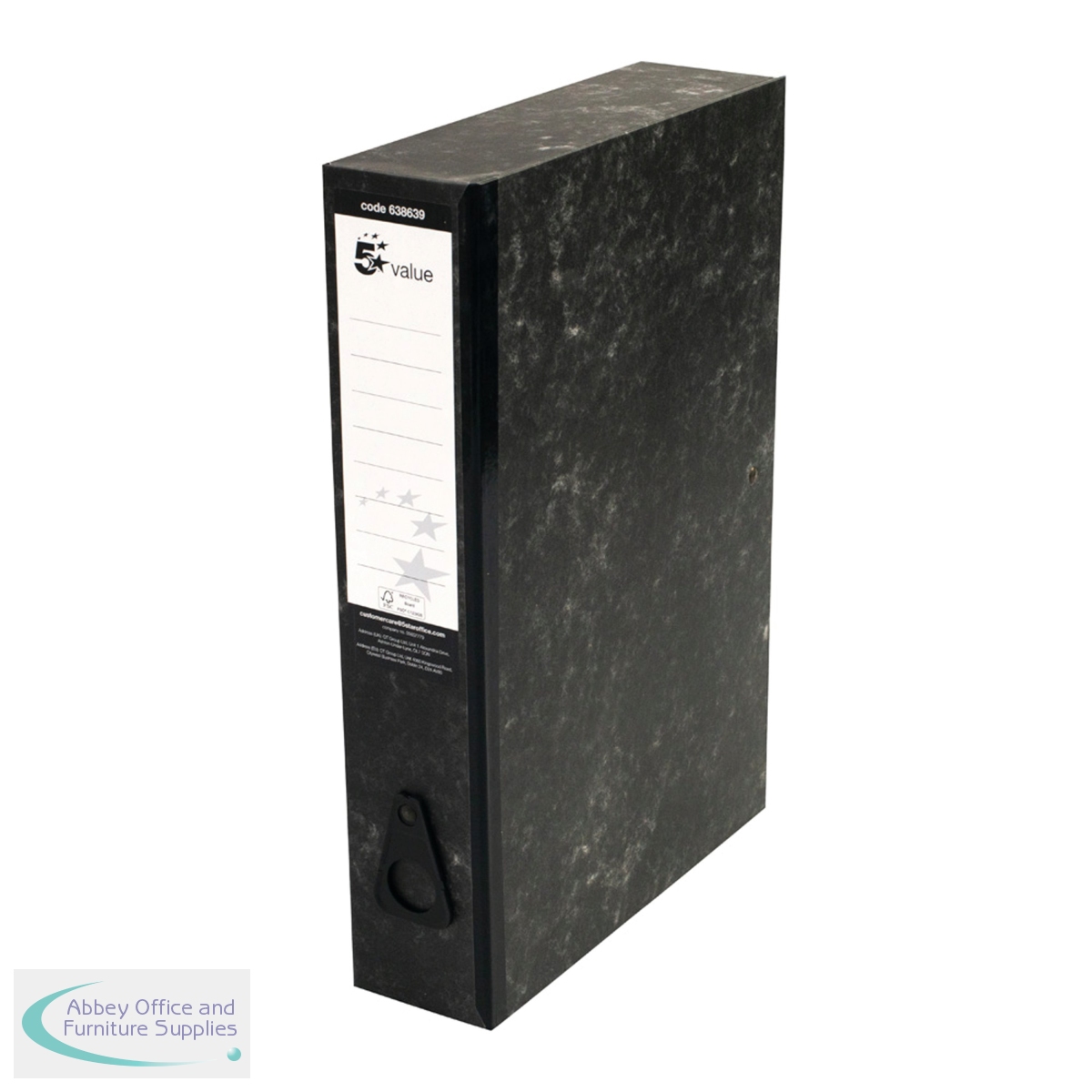 5 Star is a competitive range of office stationery. Designed with a press button lock ensures your documents are stored securely. To ensure easy retrieval, you can use the large label area on the spine for easy identification. Made of board, it is durable and will last a long time. This box file has sufficient capacity, which is suitable for storing foolscap-sized documents.